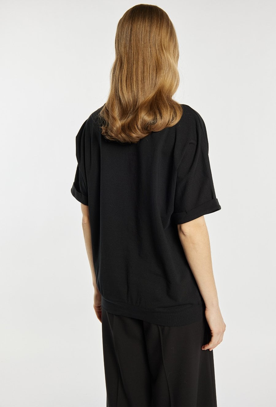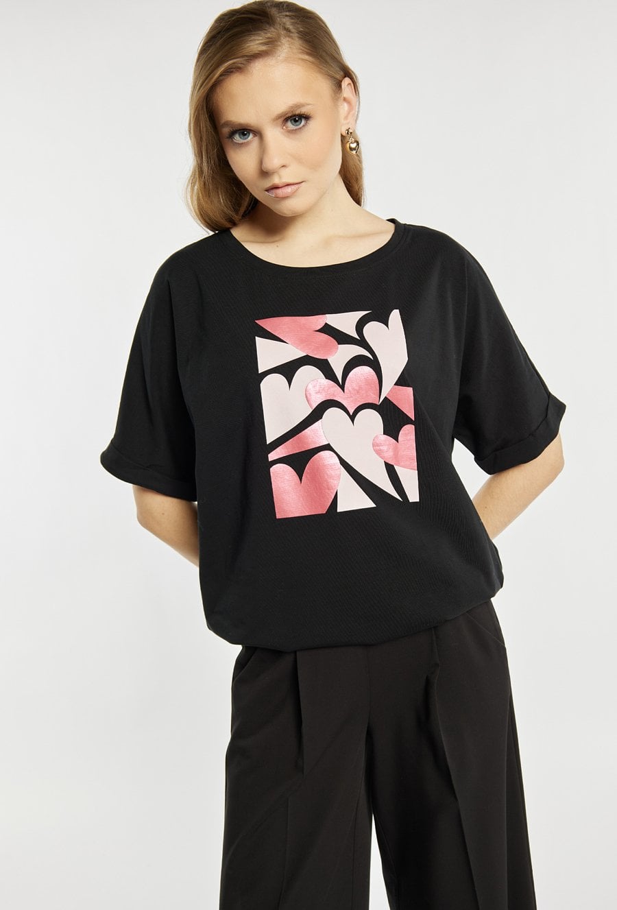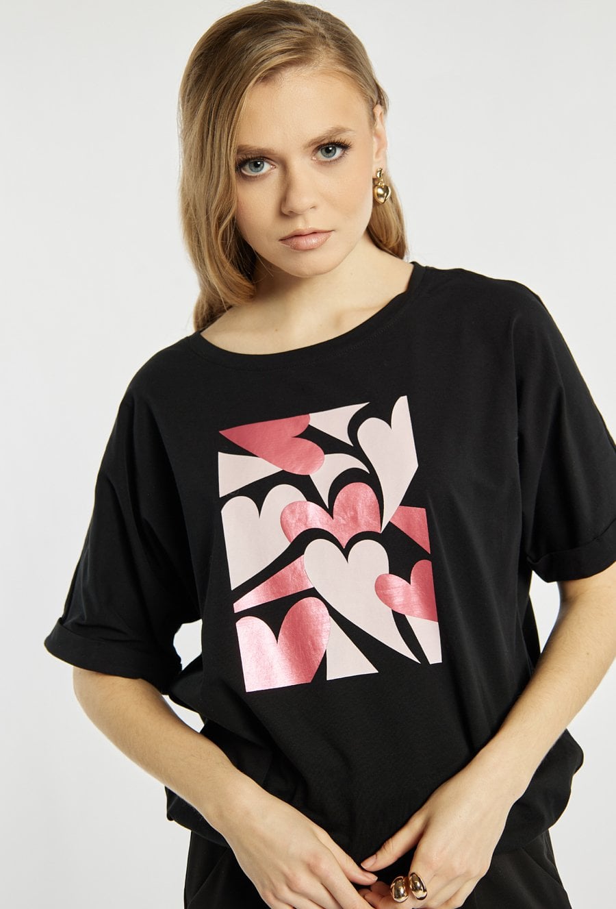 T-shirt o luźniejszym kroju z krótkim rękawem zdobi nadruk w formie stylizowanych serc w metalicznym wykończeniu, co nadaje mu romantycznego i nowoczesnego charakteru. Model świetny na co dzień, zwłaszcza jako element walentynkowych stylizacji. Modelka na zdjęciu ma 177 cm wzrostu i prezentuje rozmiar S.
