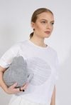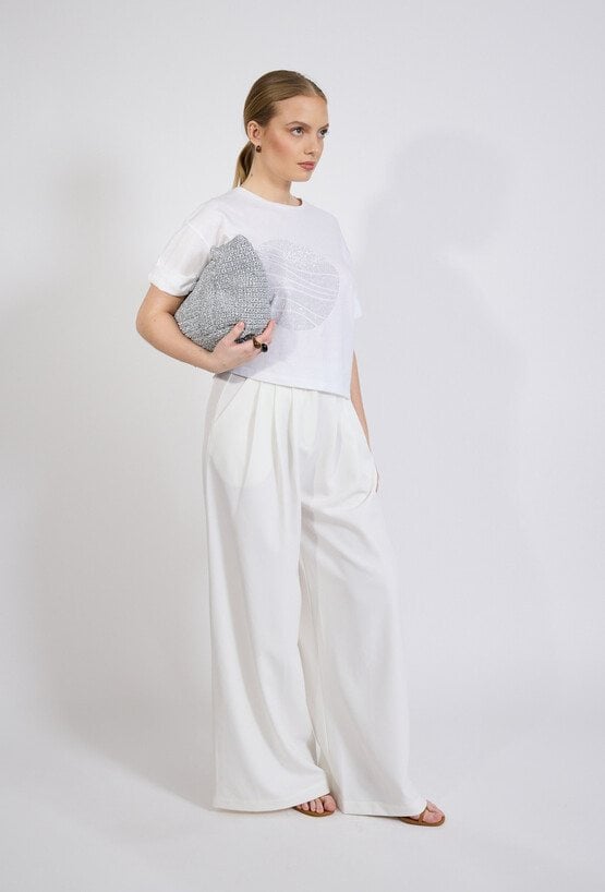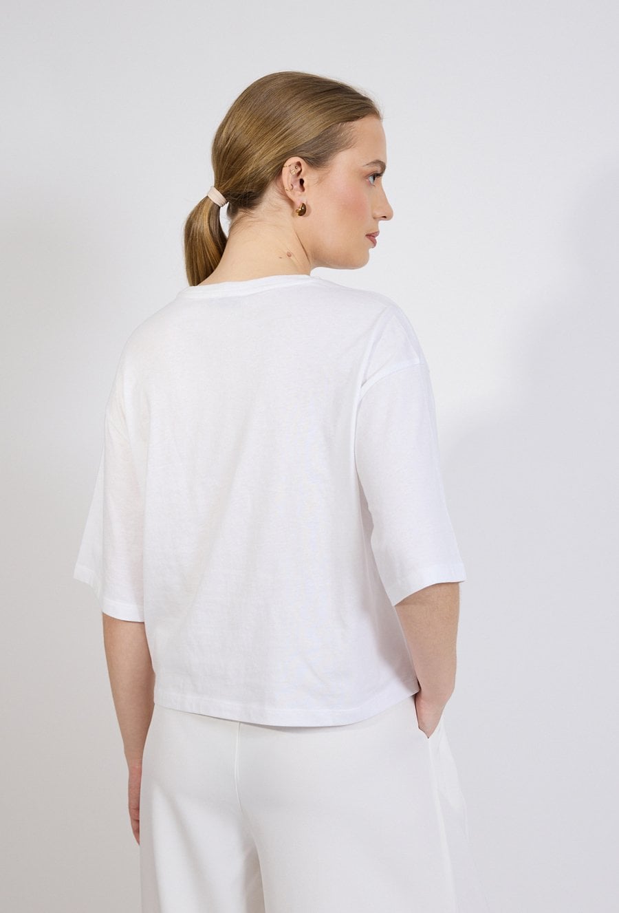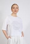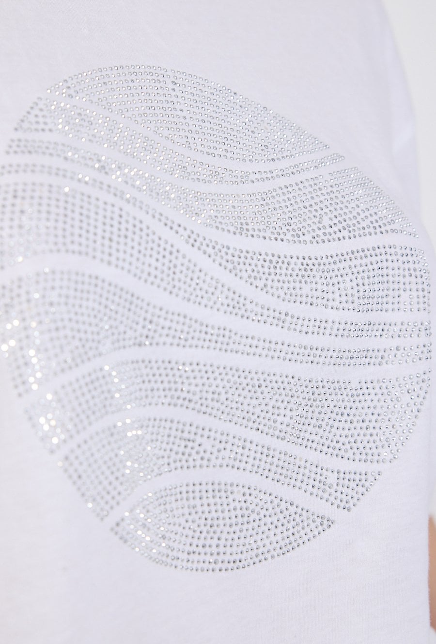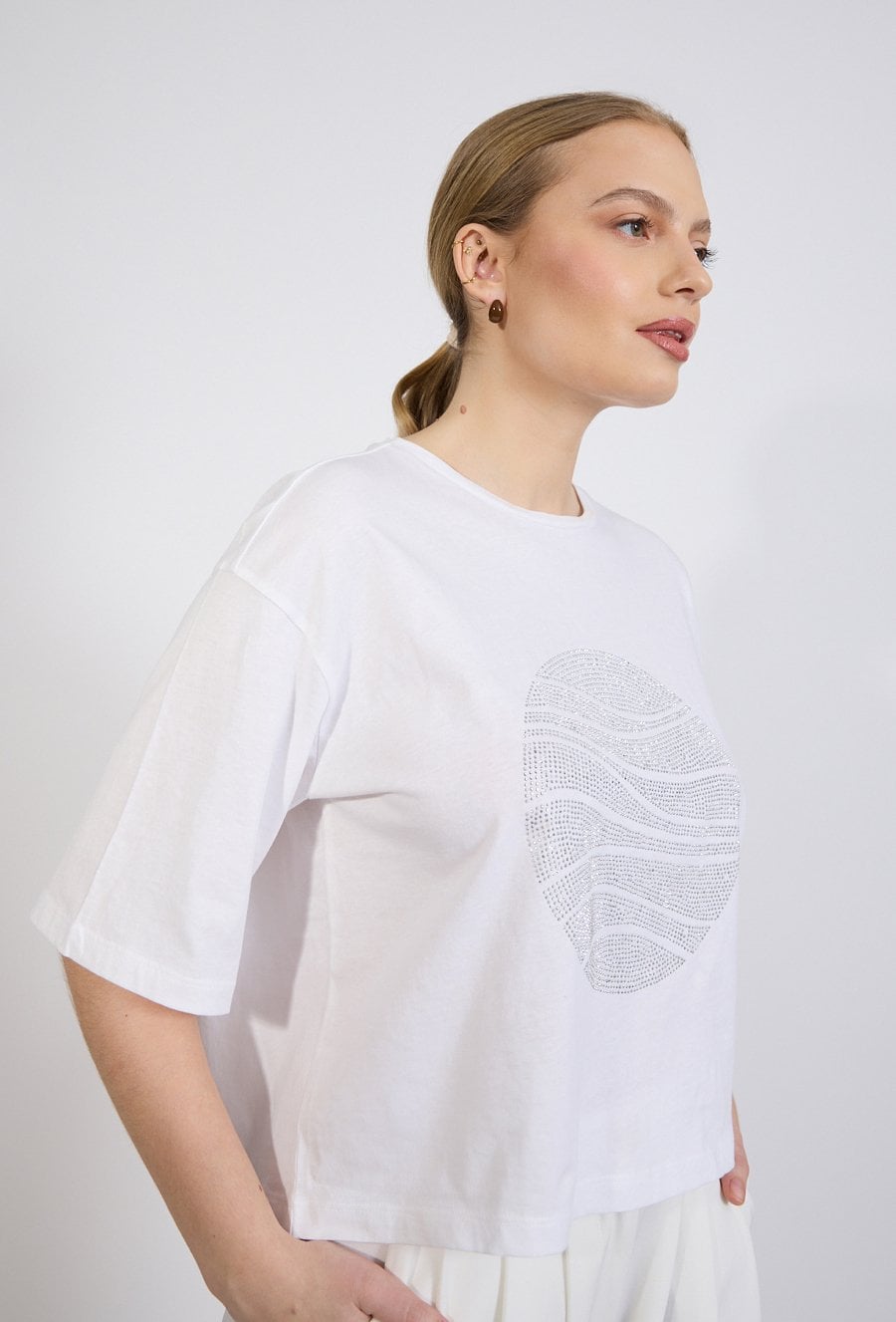 T-shirt damski o swobodnym, nowoczesnym kroju. Model z rękawem o długości do łokcia oraz klasycznym, zaokrąglonym dekoltem. Przód zdobi efektowna aplikacja z drobnych, połyskujących elementów w formie okrągłego motywu z falistym wzorem, która nadaje koszulce eleganckiego charakteru. Modelka na zdjęciu ma 177 cm wzrostu i prezentuje rozmiar S.