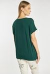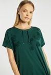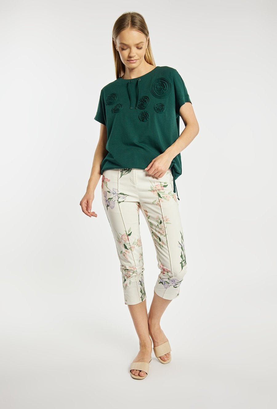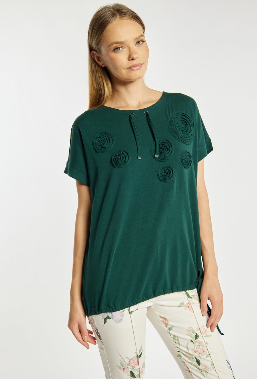 T-shirt damski o luźnym, komfortowym kroju z krótkim rękawem. Model z okrągłym dekoltem oraz ozdobnymi troczkami przy szyi, które nadają całości nowoczesnego charakteru. Całość zdobią efektowne, przestrzenne aplikacje kwiatowe. T-shirt idealny do codziennych stylizacji z modowym akcentem. Modelka na zdjęciu ma 177 cm wzrostu i prezentuje rozmiar S.