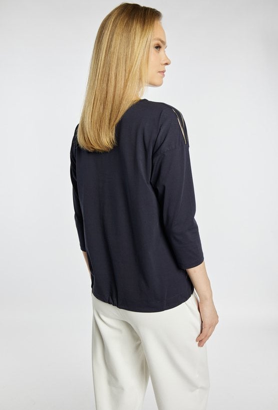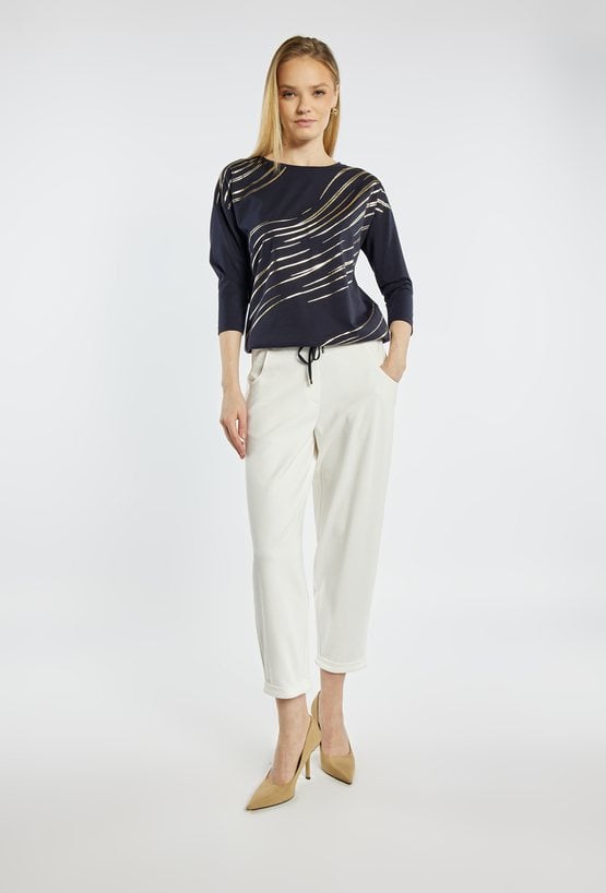 T-shirt damski z okrągłym dekoltem oraz rękawami o długości 3/4. Z przodu ozdobiony efektownym, złotym nadrukiem o falistym motywie, który nadaje całości eleganckiego i nowoczesnego charakteru. Idealny do codziennych i półeleganckich stylizacji. Modelka na zdjęciu ma 177 cm wzrostu i prezentuje rozmiar S.