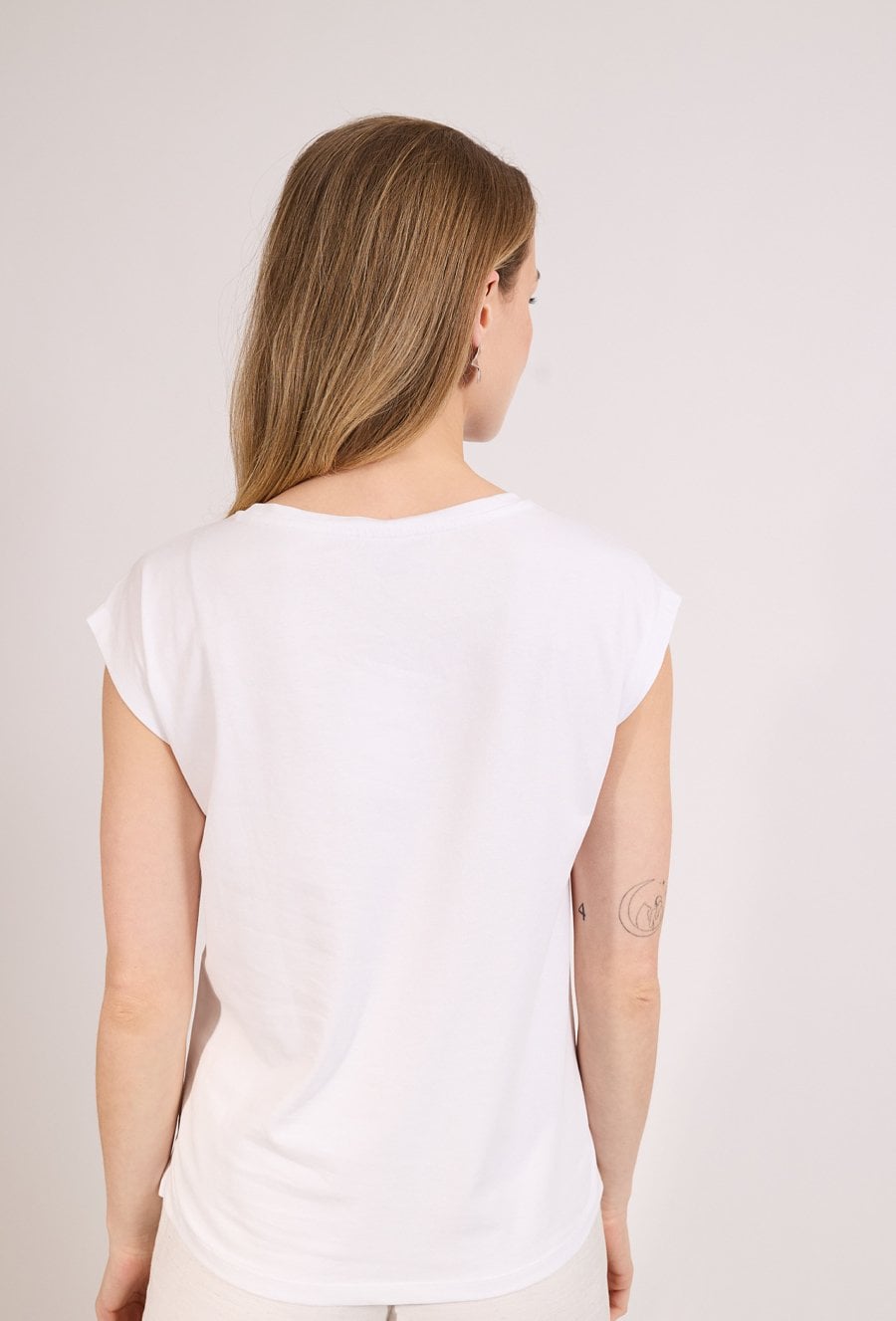 T-shirt damski o luźnym kroju z krótkim rękawem. Model z okrągłym dekoltem oraz subtelnym nadrukiem w formie serca, który nadaje całości delikatnego, kobiecego charakteru. T-shirt doskonale sprawdzi się w codziennych i casualowych stylizacjach, zapewniając komfort i wygodę noszenia. Modelka na zdjęciu ma 177 cm wzrostu i prezentuje rozmiar S.