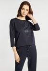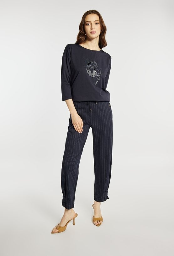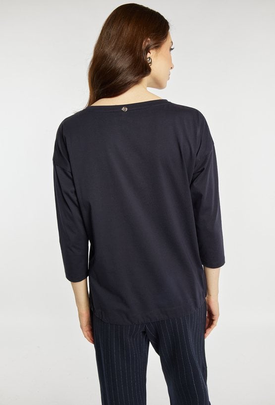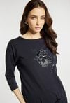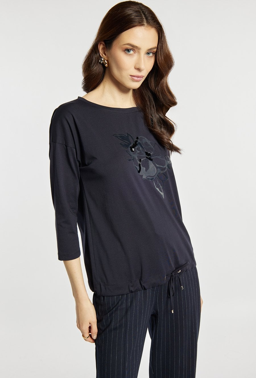 T-shirt z rękawem 3/4 i półokrągłym dekoltem wyróżnia się dekoracyjną aplikacją z motywem kwiatowym na froncie, która nadaje całości subtelnie eleganckiego charakteru. Model idealny do codziennych i casualowych stylizacji. Modelka na zdjęciu ma 177 cm wzrostu i prezentuje rozmiar S.
