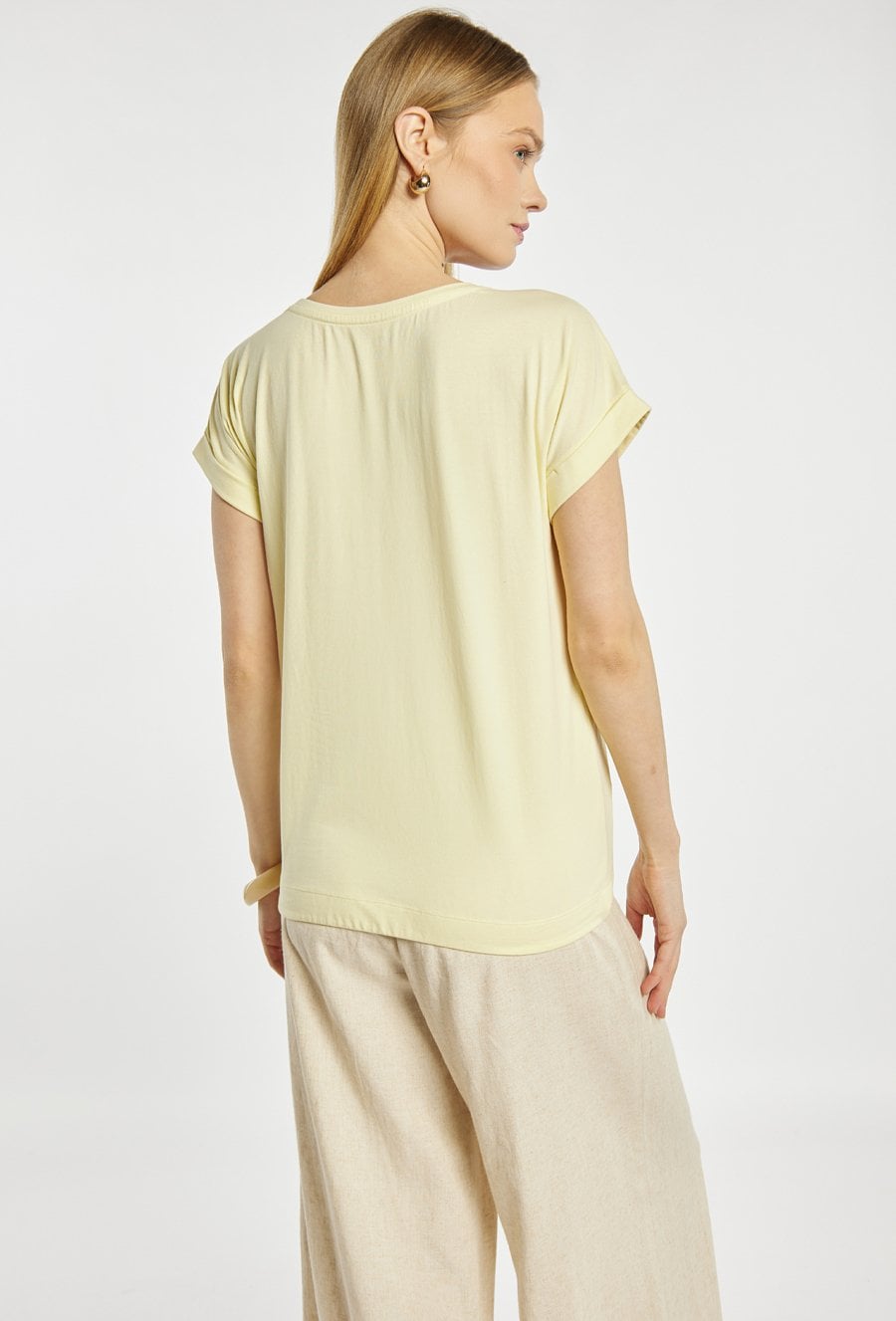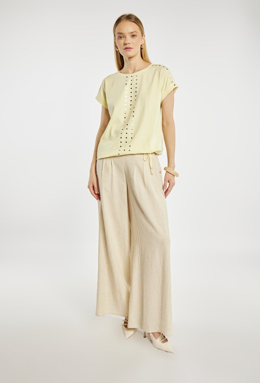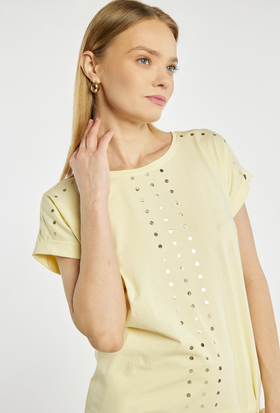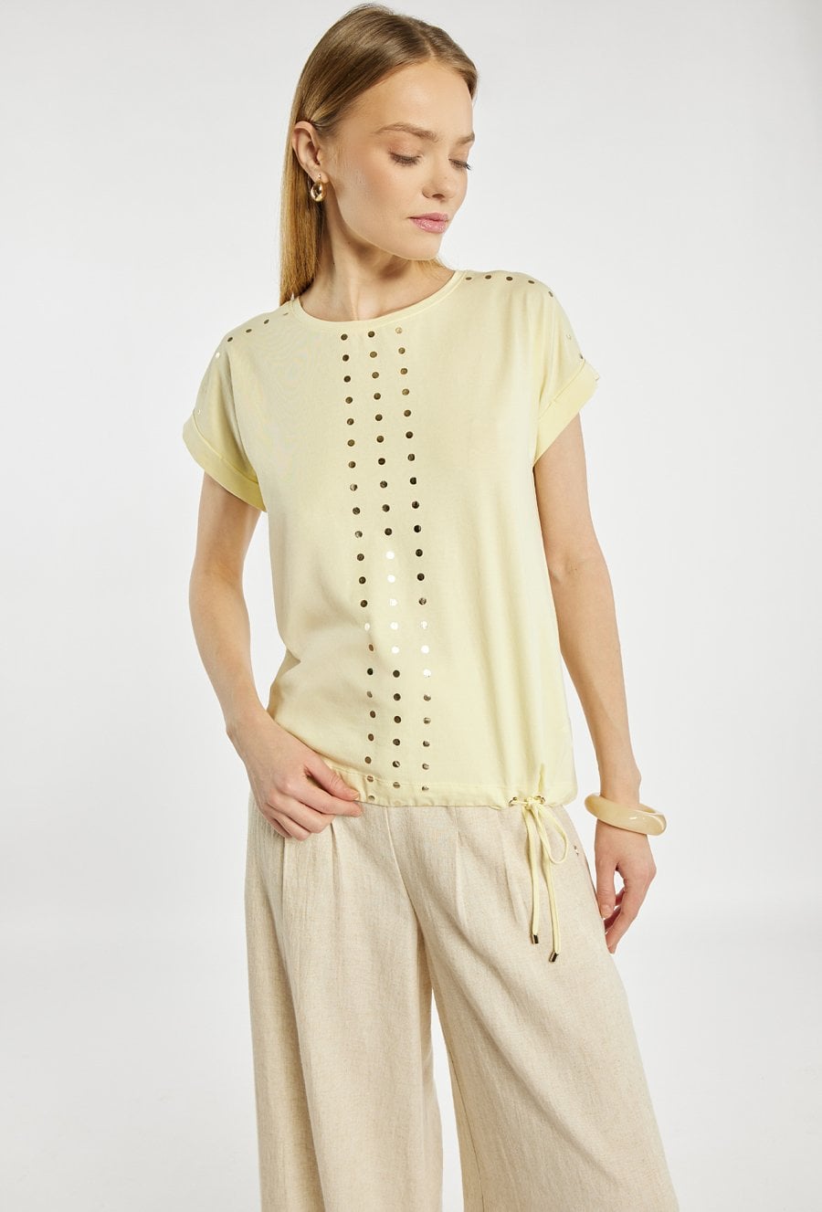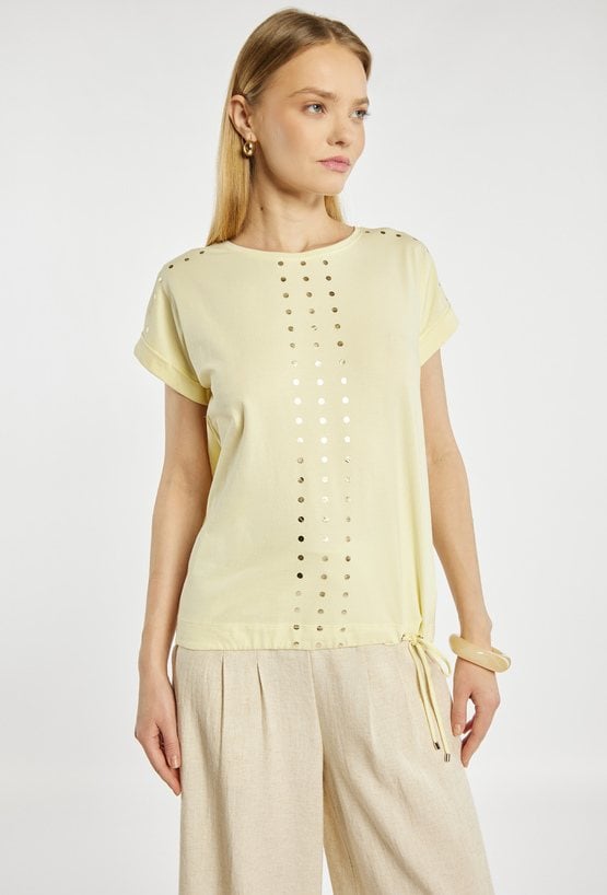 T-shirt damski z okrągłym dekoltem oraz krótkimi rękawami z podwinięciem. Z przodu ozdobiony pionowym, dekoracyjnym motywem z metalicznych kropek, który nadaje całości nowoczesnego charakteru. U dołu znajduje się regulowane wiązanie, pozwalające dopasować fason do sylwetki. Idealny do codziennych stylizacji z jeansami lub spodniami materiałowymi. Modelka na zdjęciu ma 177 cm wzrostu i prezentuje rozmiar S.