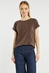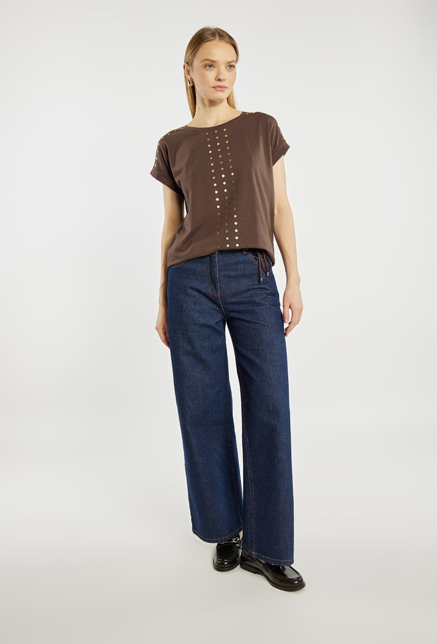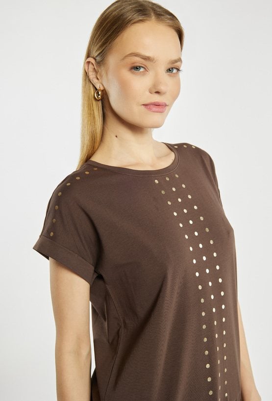 T-shirt damski z okrągłym dekoltem oraz krótkimi rękawami z podwinięciem. Z przodu ozdobiony pionowym, dekoracyjnym motywem z metalicznych kropek, który nadaje całości nowoczesnego charakteru. U dołu znajduje się regulowane wiązanie, pozwalające dopasować fason do sylwetki. Idealny do codziennych stylizacji z jeansami lub spodniami materiałowymi. Modelka na zdjęciu ma 177 cm wzrostu i prezentuje rozmiar S.