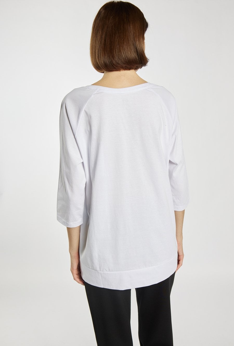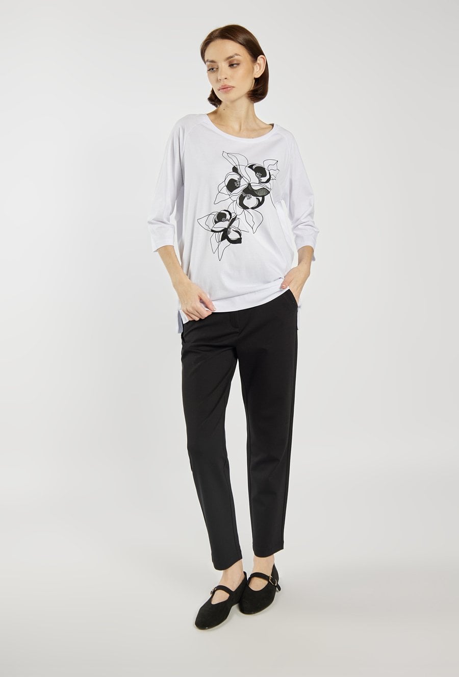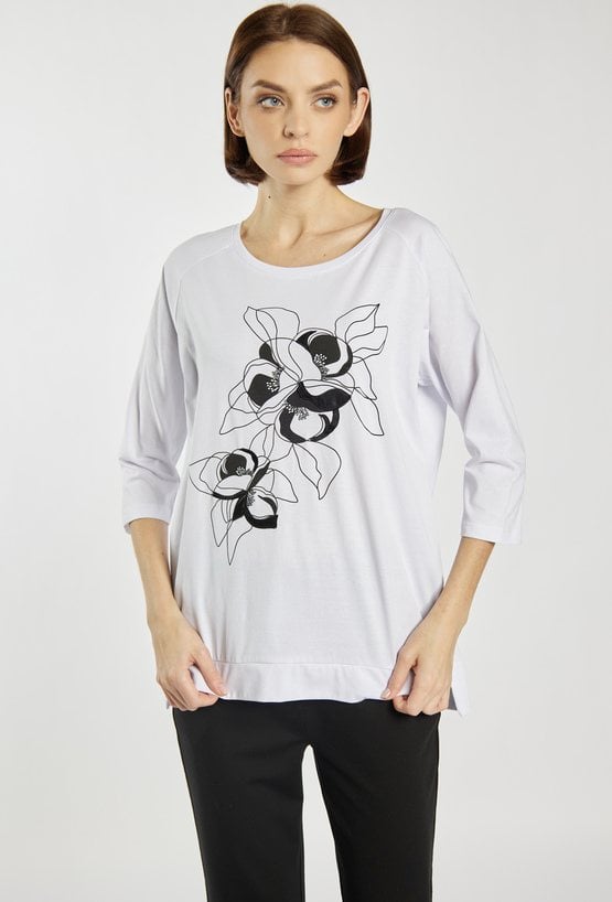 T-shirt o luźnym kroju z rękawem 3/4 wyróżnia się efektownym, kwiatowym nadrukiem w kontrastowej kolorystyce. Model świetnie sprawdzi się na co dzień, jako wygodna i stylowa baza wielu stylizacji. Modelka na zdjęciu ma 177 cm wzrostu i prezentuje rozmiar S.