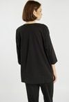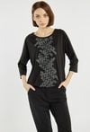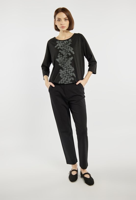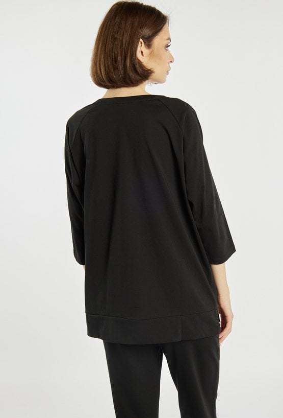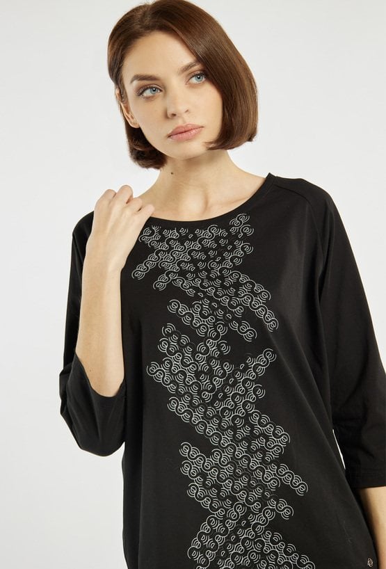 T-shirt o luźnym kroju z rękawem 3/4 wyróżnia się dekoracyjnym, graficznym nadrukiem na froncie, który nadaje całości nowoczesnego charakteru. Model świetnie sprawdzi się w codziennych, casualowych stylizacjach. Modelka na zdjęciu ma 177 cm wzrostu i prezentuje rozmiar S.
