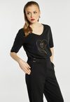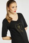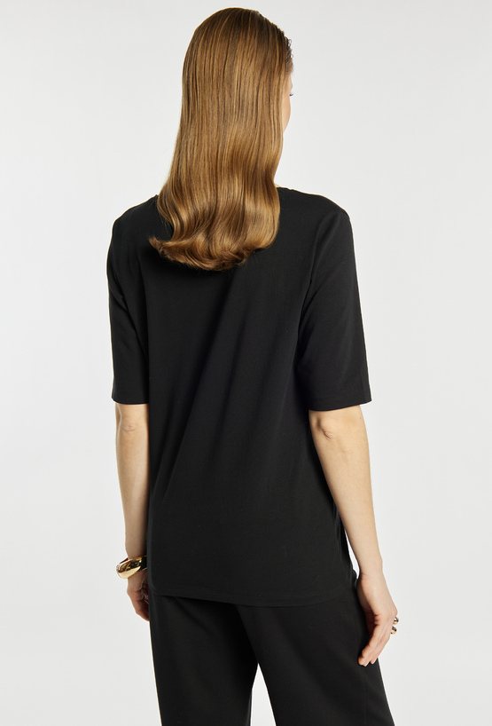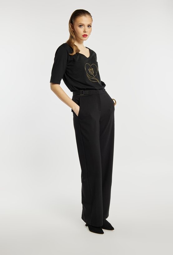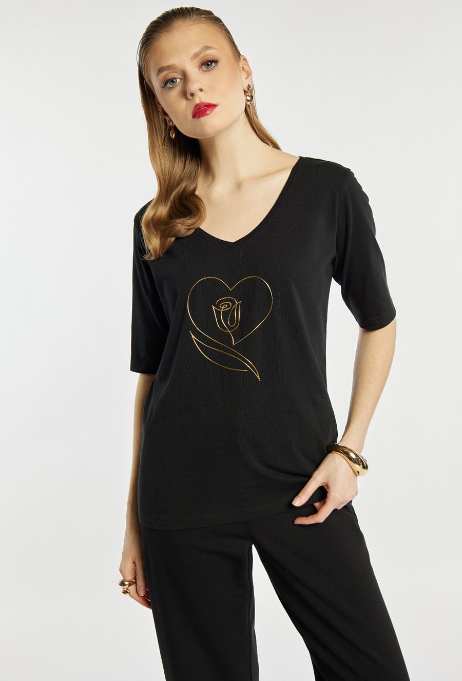 T-shirt damski o prostym, wygodnym kroju. T-shirt ma dekolt w kształcie litery V oraz ozdobny nadruk z motywem serca i subtelną grafiką kwiatową. T-shirt świetnie uzupełni codzienne stylizacje, dodając im lekkiej, kobiecej elegancji. Modelka na zdjęciu ma 177 cm wzrostu i prezentuje rozmiar S.