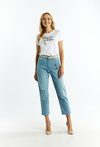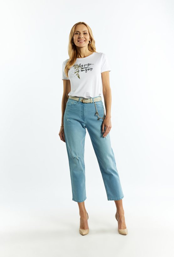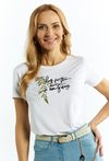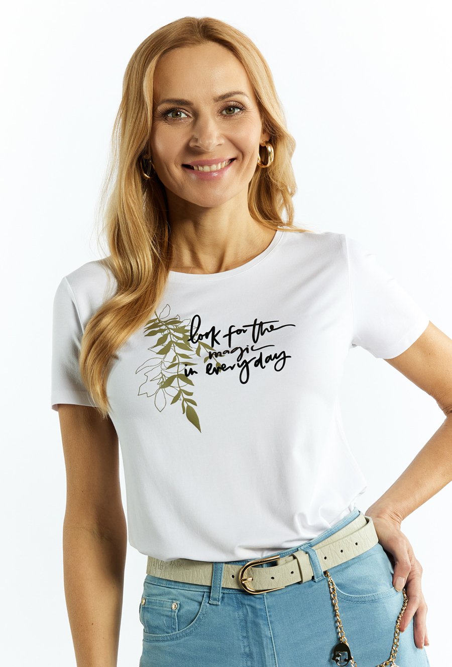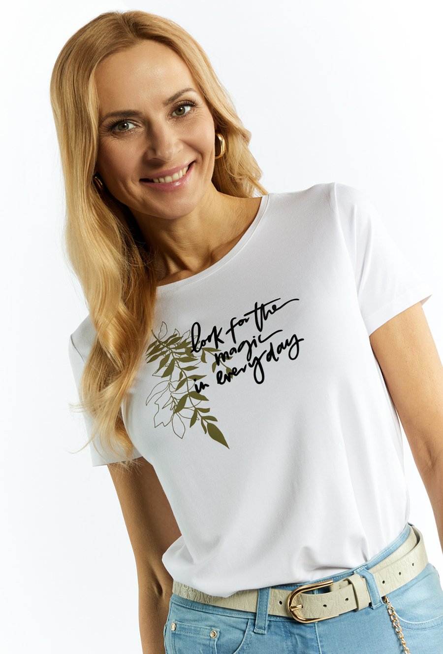 Wiskozowy T-shirt damski z dodatkiem elastycznych włókien. T-shirt z krótkim rękawem, półokrągłym dekoltem oraz wzorem z napisem na przednim panelu. Model ten świetnie sprawdzi się na co dzień. Modelka na zdjęciu ma 177 cm wzrostu i prezentuje rozmiar S.