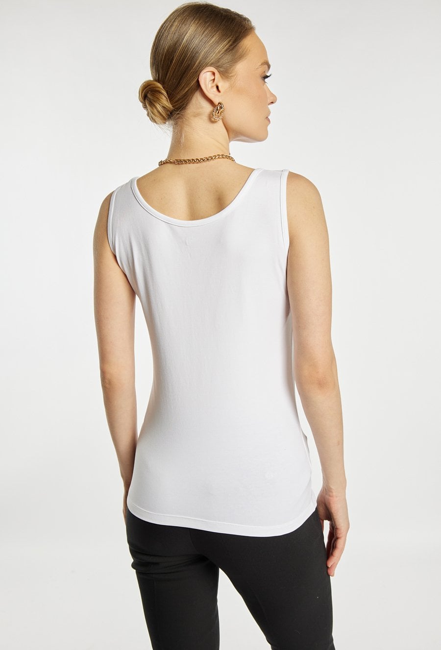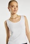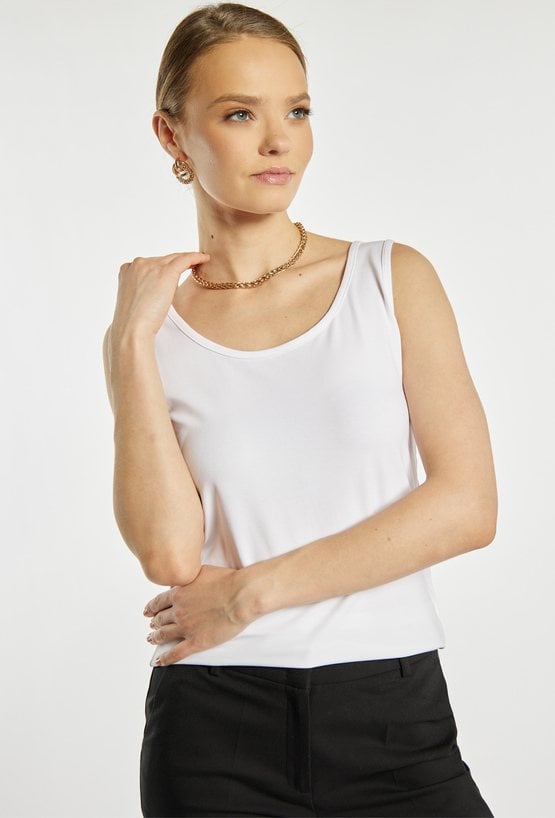 Top damski o dopasowanym, minimalistycznym kroju. Model na szerokich ramiączkach z półokrągłym dekoltem, który subtelnie podkreśla linię szyi i ramion. Gładka, elastyczna tkanina zapewnia komfort noszenia i dobre dopasowanie do sylwetki. Modelka na zdjęciu ma 177 cm wzrostu i prezentuje rozmiar S.