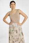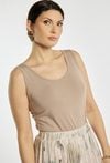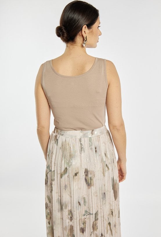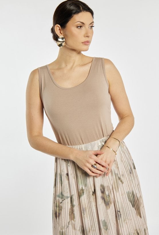 Top damski o dopasowanym, minimalistycznym kroju. Model na szerokich ramiączkach z półokrągłym dekoltem, który subtelnie podkreśla linię szyi i ramion. Gładka, elastyczna tkanina zapewnia komfort noszenia i dobre dopasowanie do sylwetki. Modelka na zdjęciu ma 177 cm wzrostu i prezentuje rozmiar S.