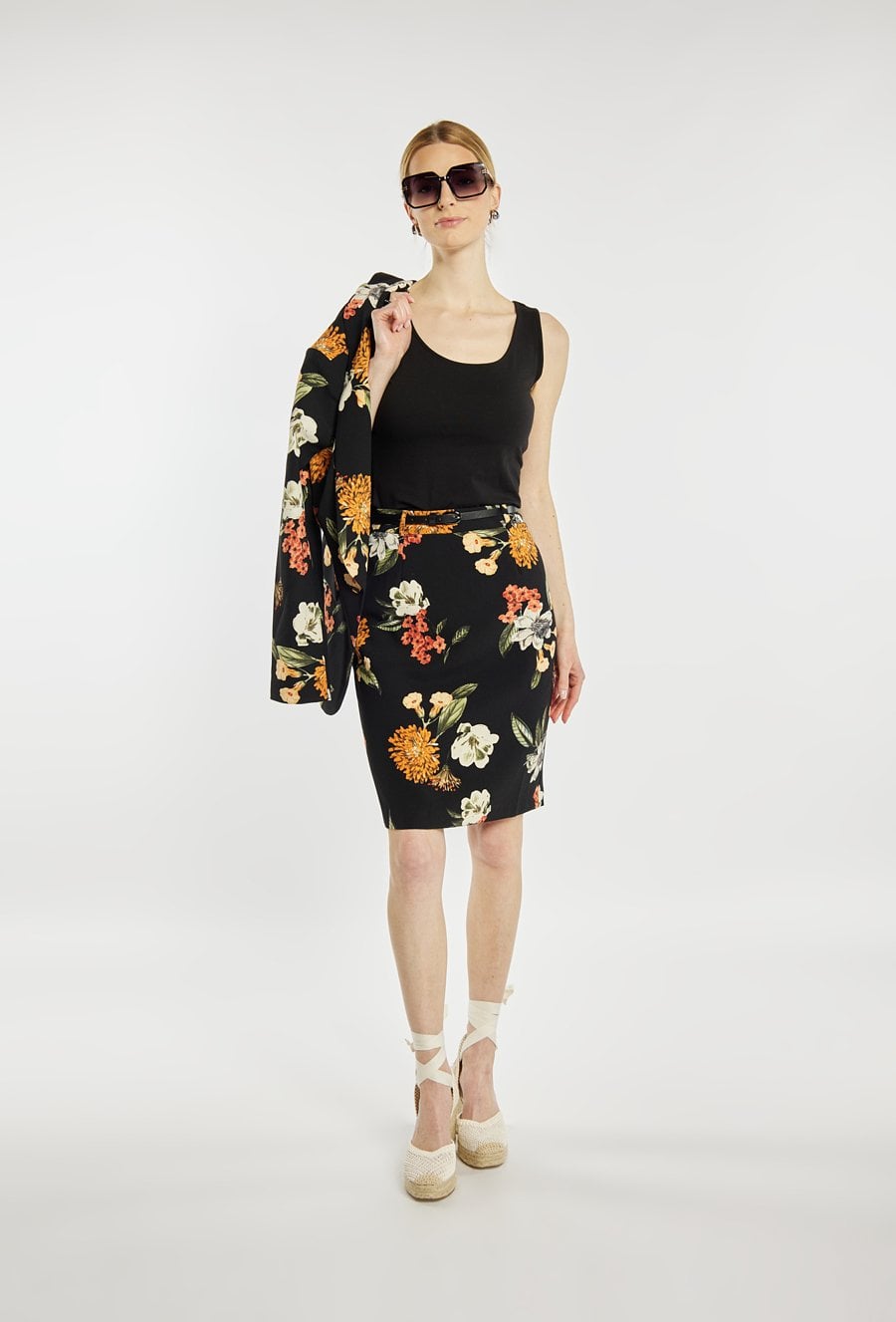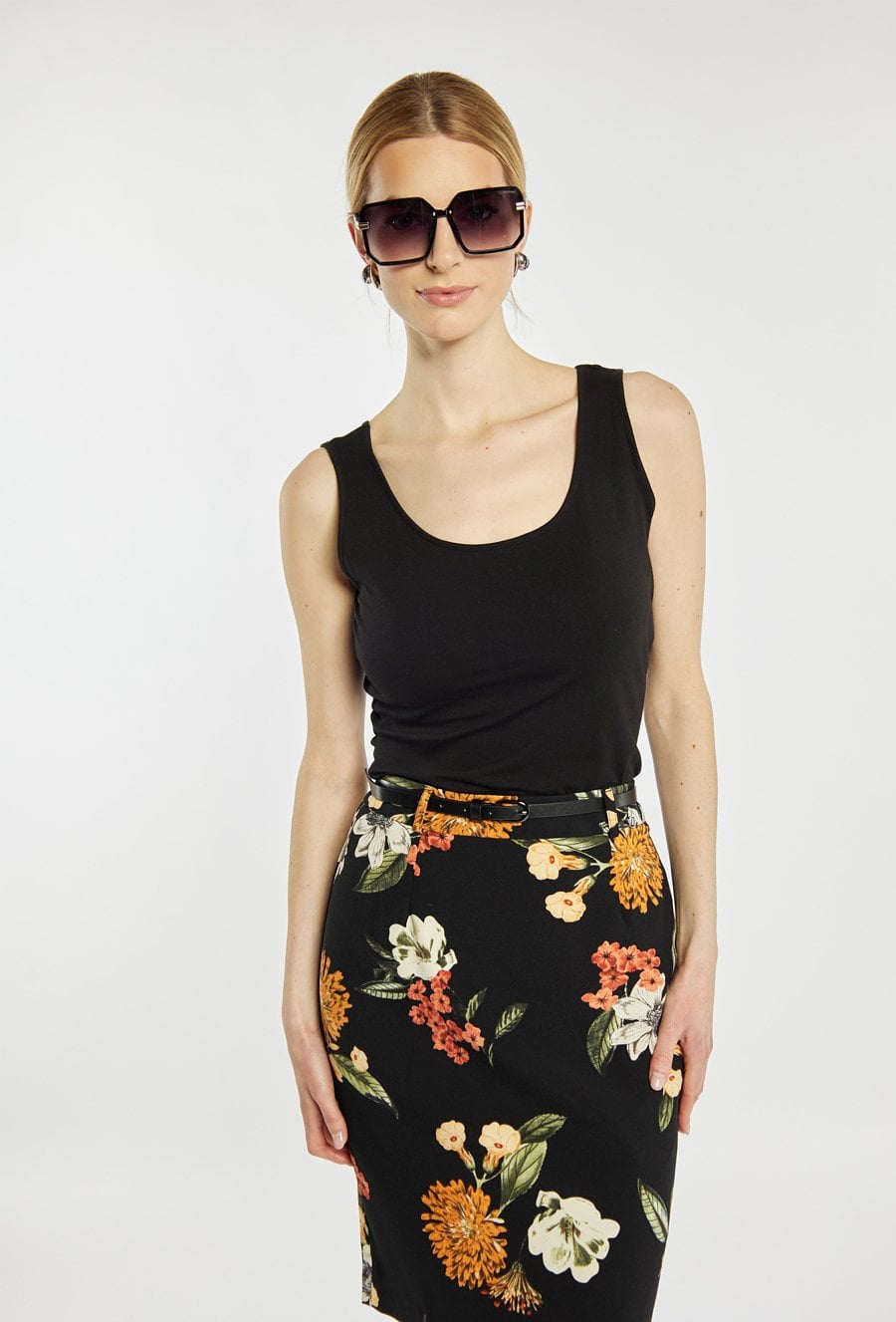 Top damski o dopasowanym, minimalistycznym kroju. Model na szerokich ramiączkach z półokrągłym dekoltem, który subtelnie podkreśla linię szyi i ramion. Gładka, elastyczna tkanina zapewnia komfort noszenia i dobre dopasowanie do sylwetki. Modelka na zdjęciu ma 177 cm wzrostu i prezentuje rozmiar S.
