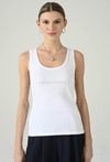 Klasyczny biały top bez rękawów, który łączy minimalistyczny styl z delikatnym akcentem brandingowym. Okrągły dekolt i dopasowany fason pięknie układają się na sylwetce, zapewniając wygodę noszenia przez cały dzień. Subtelne logo Femestage na przodzie dodaje całości nowoczesnego charakteru i wyróżnia model w prostych stylizacjach. Top świetnie sprawdzi się zarówno solo w casualowych zestawach, jak i jako baza pod marynarkę, kardigan czy koszulę. To ponadczasowy element garderoby, który łatwo dopasujesz do spodni, spódnic i szortów.