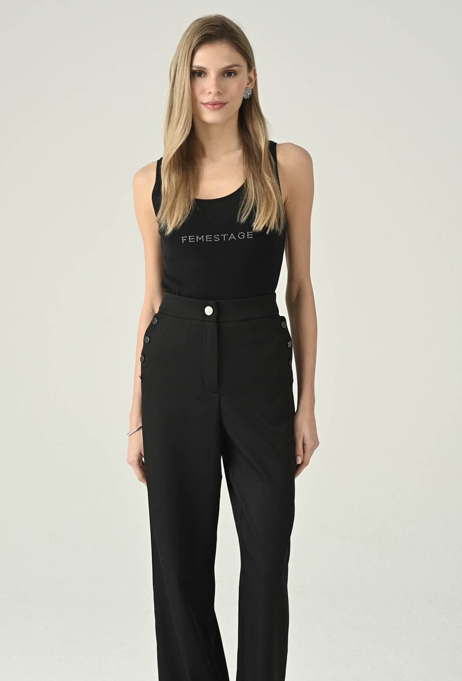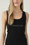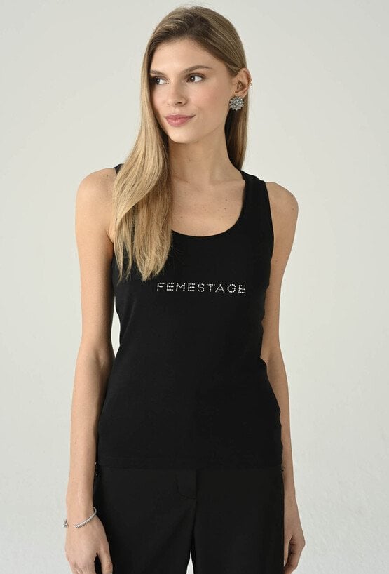 Klasyczny czarny top bez rękawów, który łączy minimalistyczną formę z nowoczesnym akcentem. Okrągły dekolt i dopasowany fason świetnie układają się na sylwetce, zapewniając komfort noszenia przez cały dzień. Subtelne logo Femestage na przodzie dodaje całości charakteru i sprawia, że model wyróżnia się w prostych zestawach. Top doskonale sprawdzi się zarówno solo, jak i w stylizacjach warstwowych — pod marynarką, kardiganem czy koszulą. To uniwersalna baza do jeansów, spodni materiałowych i spódnic, idealna na co dzień i do pracy w casualowym wydaniu.