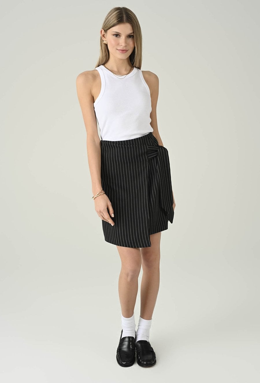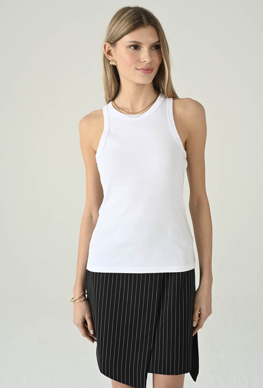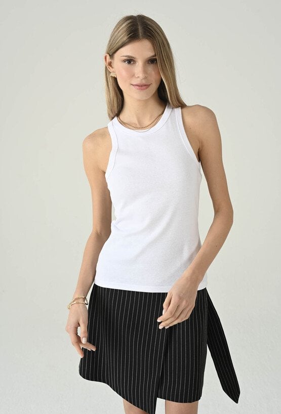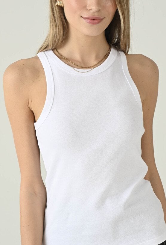 Minimalistyczny biały top bez rękawów, który świetnie sprawdzi się jako uniwersalna baza do wielu stylizacji. Okrągły dekolt nadaje mu klasycznego charakteru, a dopasowany fason ładnie układa się na sylwetce i zapewnia komfort noszenia. Model pięknie prezentuje się solo w letnich zestawach, ale równie dobrze sprawdza się warstwowo — pod marynarką, koszulą lub kardiganem. To ponadczasowy element garderoby, po który chętnie sięgniesz na co dzień, do pracy i na weekendowe wyjścia.