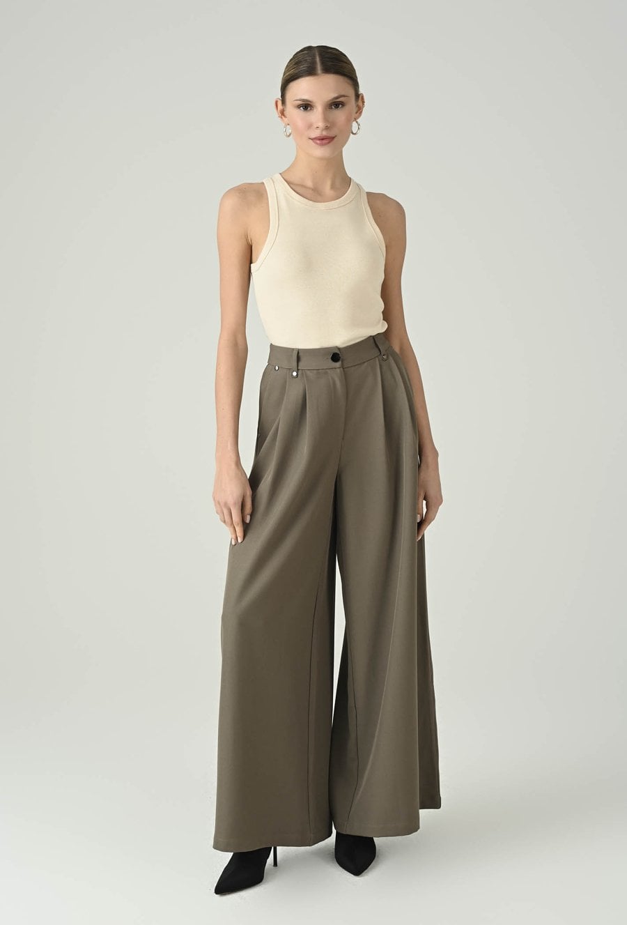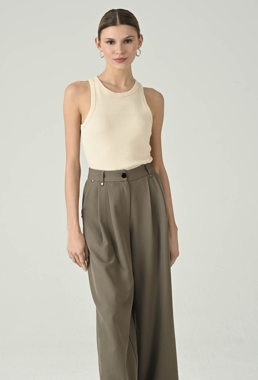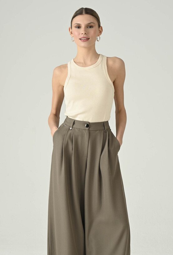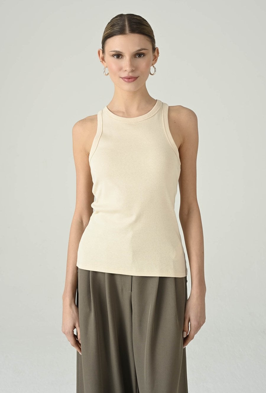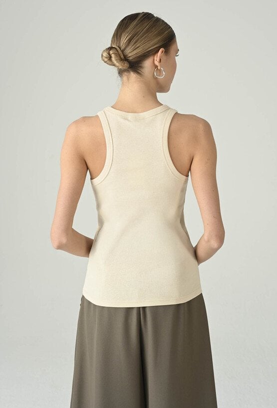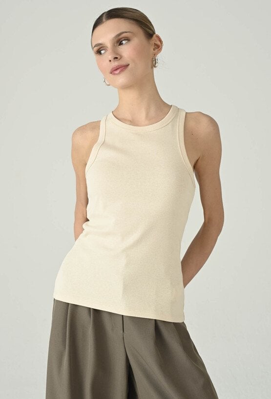 Minimalistyczny top w beżowym odcieniu, który świetnie sprawdzi się jako uniwersalna baza do wielu stylizacji. Okrągły dekolt nadaje mu klasycznego charakteru, a dopasowany fason ładnie układa się na sylwetce i zapewnia komfort noszenia. Model pięknie prezentuje się solo w codziennych zestawach, ale równie dobrze sprawdza się warstwowo — pod marynarką, koszulą lub kardiganem. To ponadczasowy element garderoby, który pozwala tworzyć dopracowane, kobiece stylizacje na co dzień i do pracy.
