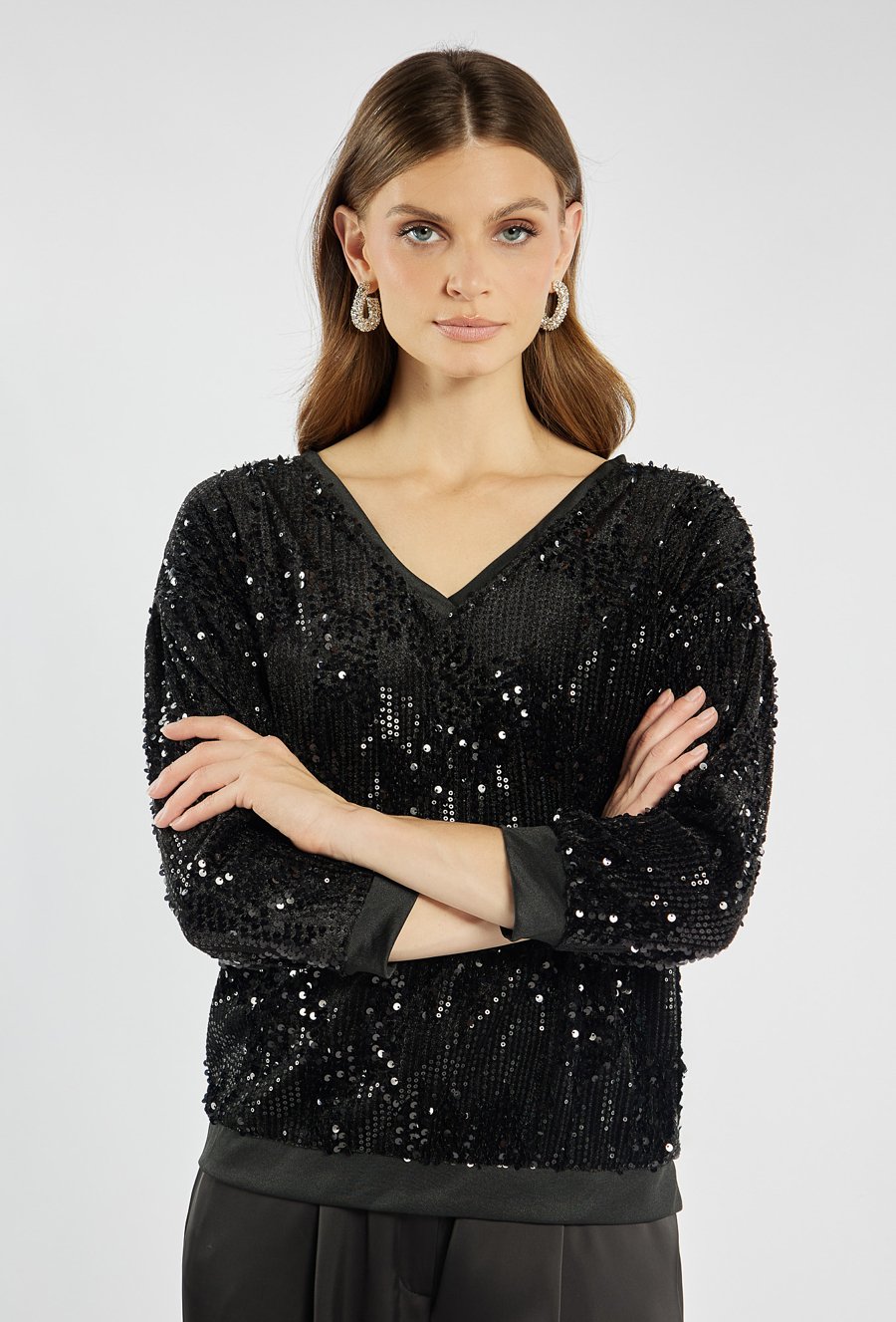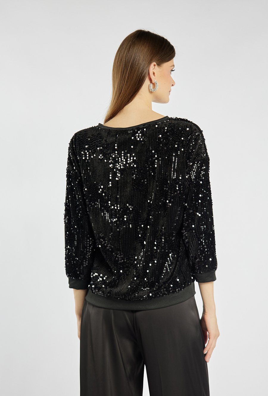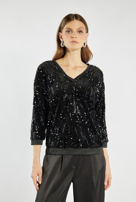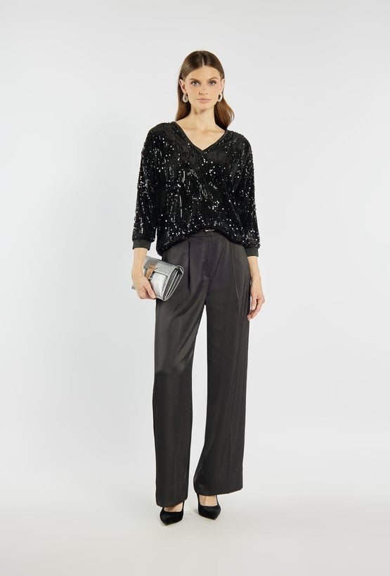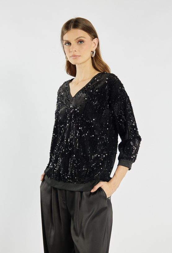 Bluzka z efektownymi cekinami, które pięknie odbijają światło i dodają stylizacji wyjątkowego blasku. Dekolt w kształcie litery V subtelnie podkreśla szyję, a luźniejszy fason zapewnia komfort noszenia. Idealna propozycja na święta, sylwestra lub eleganckie wieczorne wyjścia. Modelka na zdjęciu ma 177 cm wzrostu i prezentuje rozmiar S.