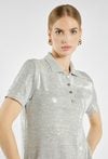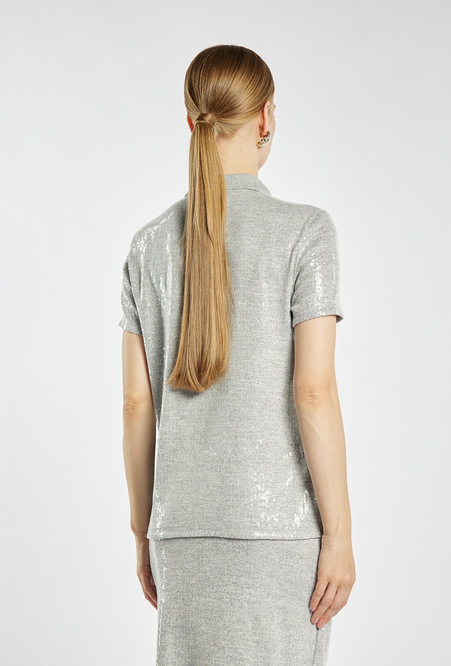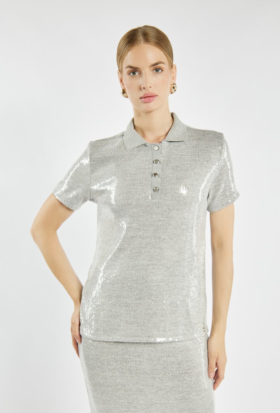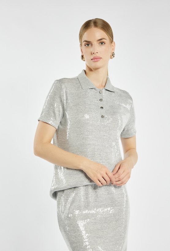 Cekinowa bluzka z krótkim rękawem i kołnierzykiem polo, zapinana na guziki. Nowoczesny fason w połączeniu z połyskującą tkaniną sprawia, że świetnie sprawdzi się zarówno w komplecie ze spódnicą. Kod do spódnicy: 25Z-SKR0960. Modelka na zdjęciu ma 177 cm wzrostu i prezentuje rozmiar S.