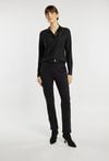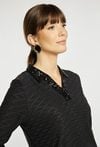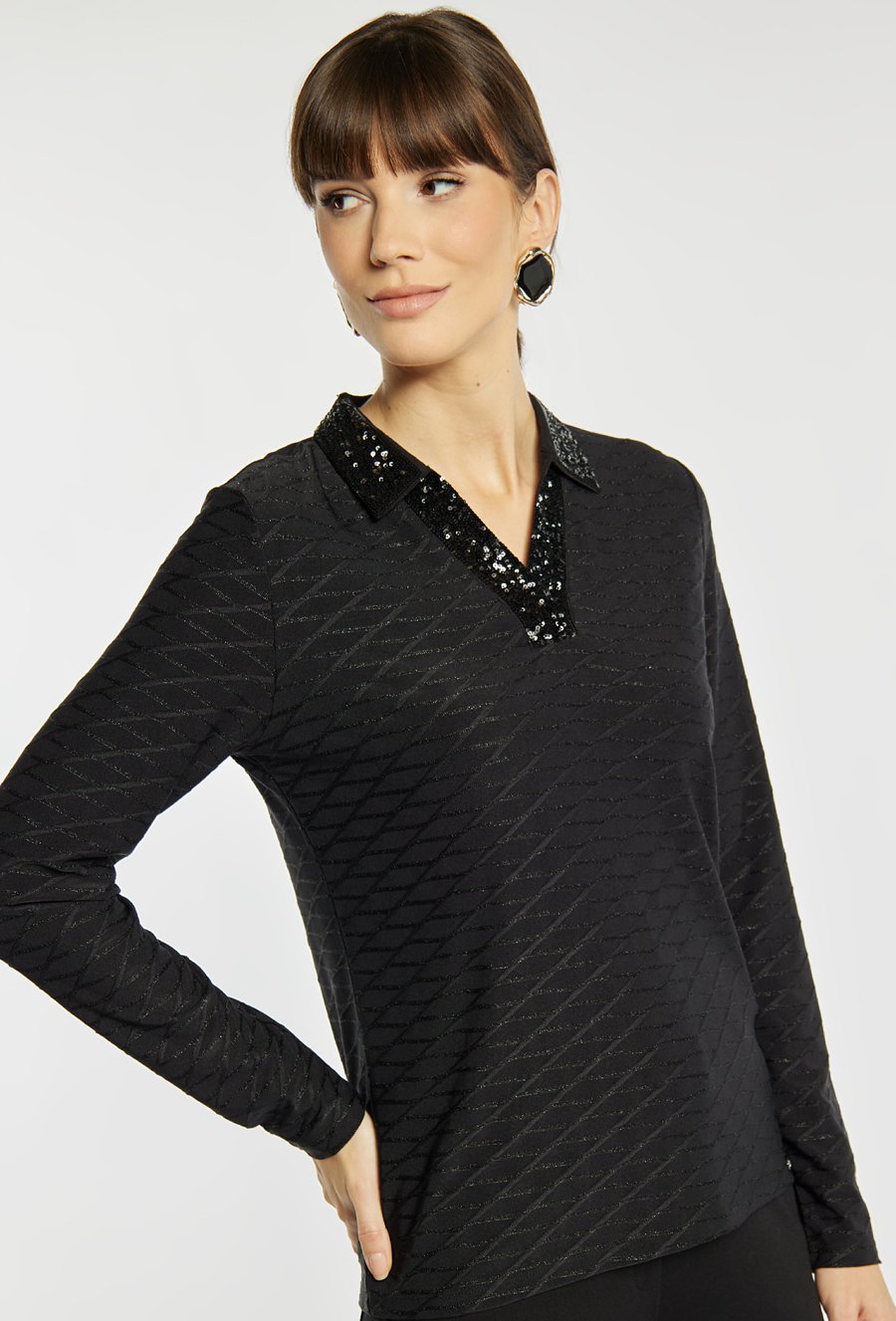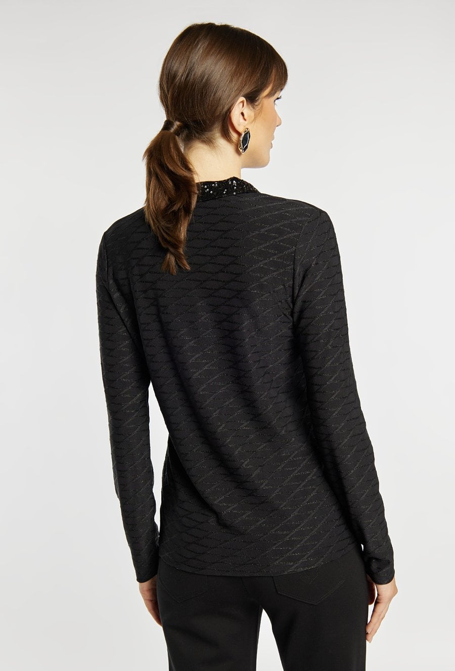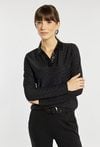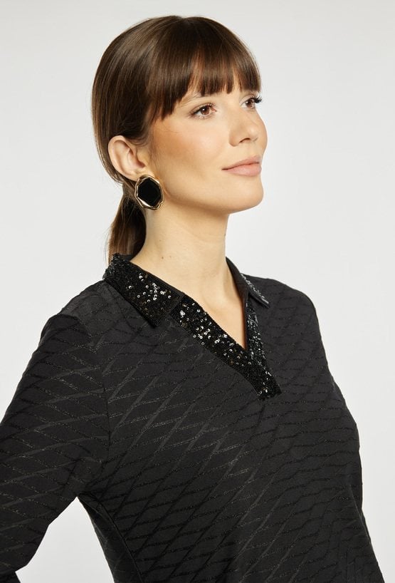 Koszula damska o eleganckim, smukłym kroju. Koszula ma długie rękawy oraz klasyczny kołnierzyk ozdobiony subtelnym połyskiem, który dodaje całości wyjątkowego charakteru. Koszula wyróżnia się delikatnym, geometrycznym wzorem na całej powierzchni. Idealna do stylizacji biurowych i bardziej formalnych zestawów. Modelka na zdjęciu ma 177 cm wzrostu i prezentuje rozmiar S.