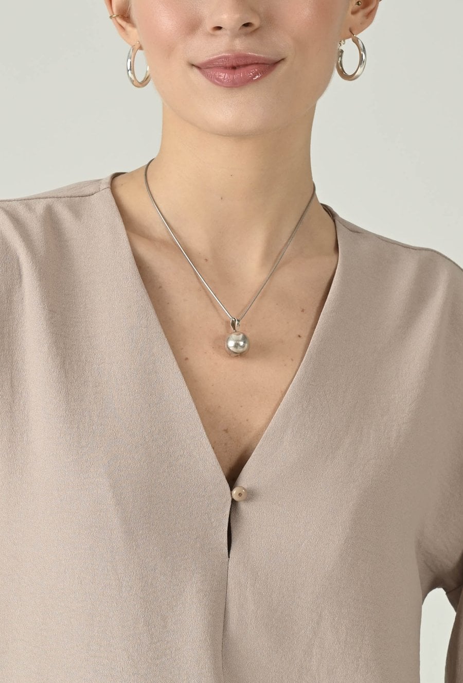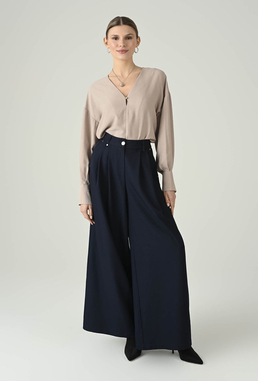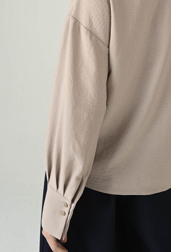 Kobieca bluzka w beżowym odcieniu, która zachwyca subtelną elegancją i uniwersalnym charakterem. Dekolt w kształcie litery V optycznie wysmukla górną część sylwetki, a delikatne zapięcie z przodu dodaje całości lekkości i dyskretnego uroku. Długie rękawy zakończone mankietami podkreślają dopracowane wykończenie, a swobodniejszy fason zapewnia komfort noszenia przez cały dzień. To idealna propozycja do biura, na spotkania i wieczorne wyjścia — świetnie komponuje się ze spodniami materiałowymi, spódnicą lub eleganckimi jeansami.