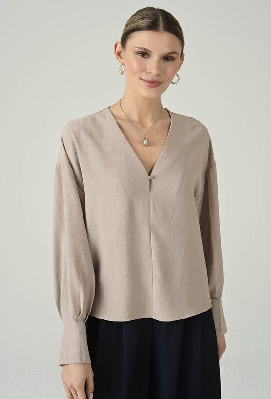Beżowa bluzka damska z dekoltem V