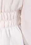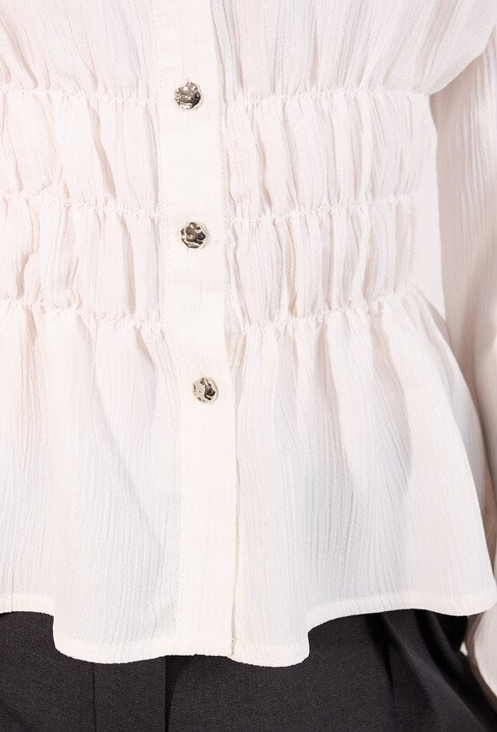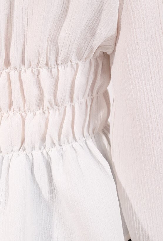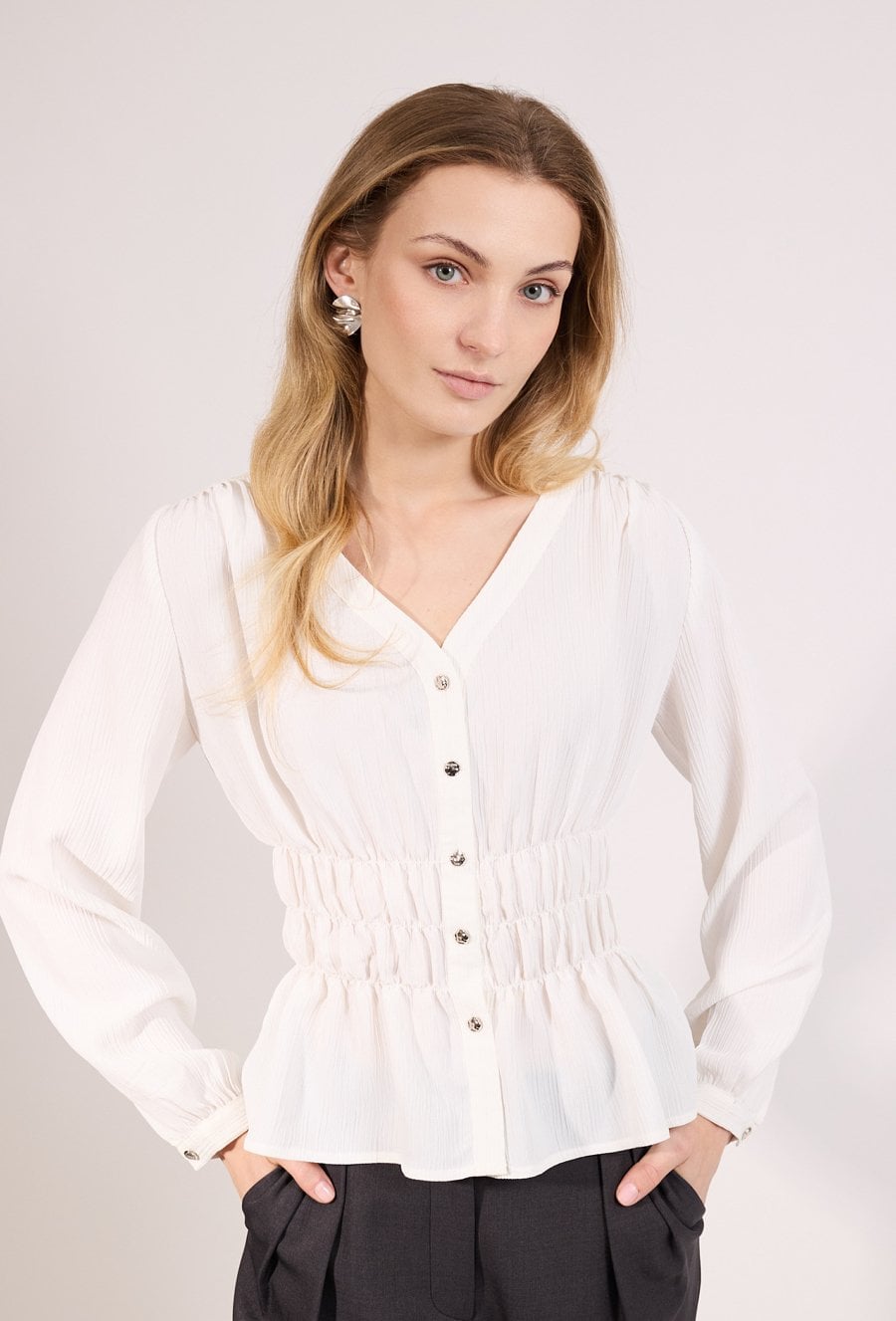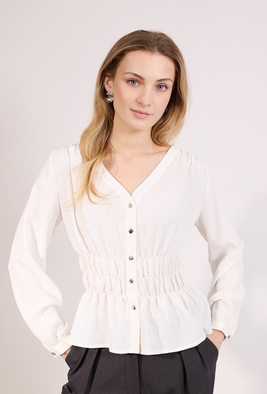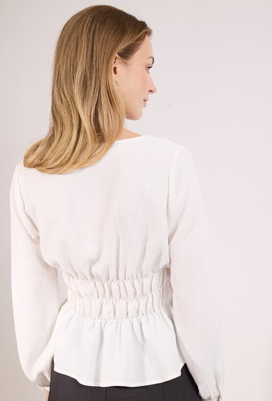 Stylowa bluzka damska o dopasowanym kroju z długim rękawem. Model zapinany na guziki z dekoltem w kształcie litery V oraz elastycznym marszczeniem w talii, które podkreśla sylwetkę. Bluzka doskonale sprawdzi się w eleganckich i codziennych stylizacjach, na spotkania oraz wyjścia.