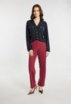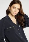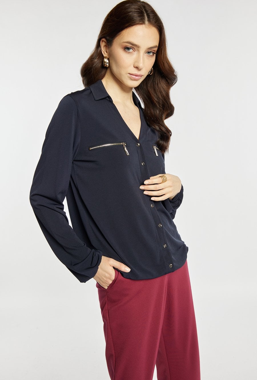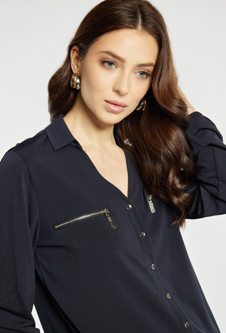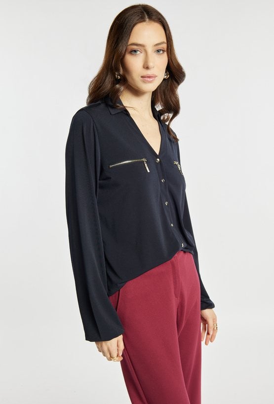 Bluzka z dekoltem w serek i długim rękawem wyróżnia się ozdobnymi guzikami na froncie oraz dekoracyjnymi suwakami w górnej części. Elastyczne wykończenie u dołu zapewnia wygodne dopasowanie i schludny wygląd. Modelka na zdjęciu ma 177 cm wzrostu i prezentuje rozmiar S.