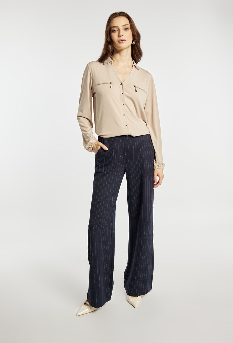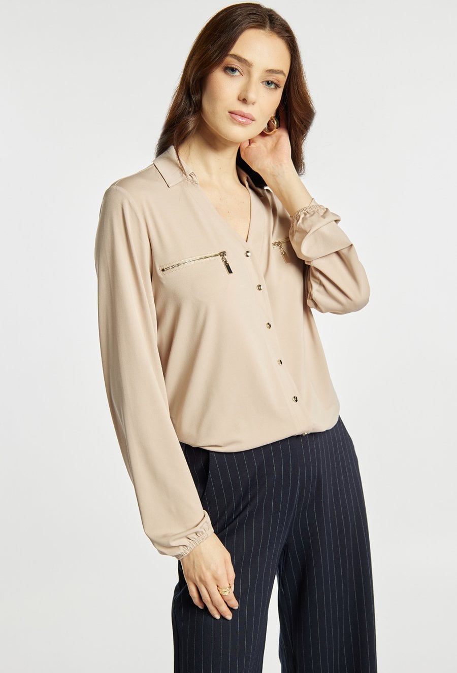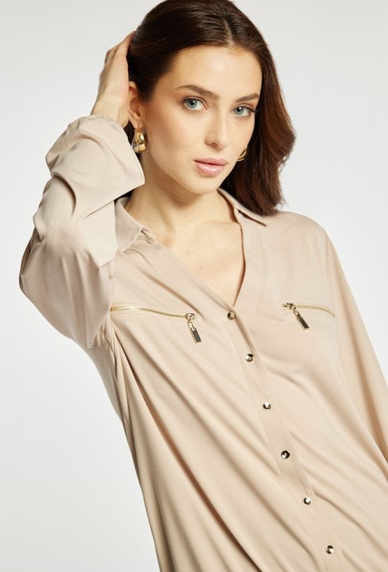 Bluzka z dekoltem w serek i długim rękawem wyróżnia się ozdobnymi guzikami na froncie oraz dekoracyjnymi suwakami w górnej części. Elastyczne wykończenie u dołu zapewnia wygodne dopasowanie i schludny wygląd. Modelka na zdjęciu ma 177 cm wzrostu i prezentuje rozmiar S.