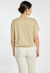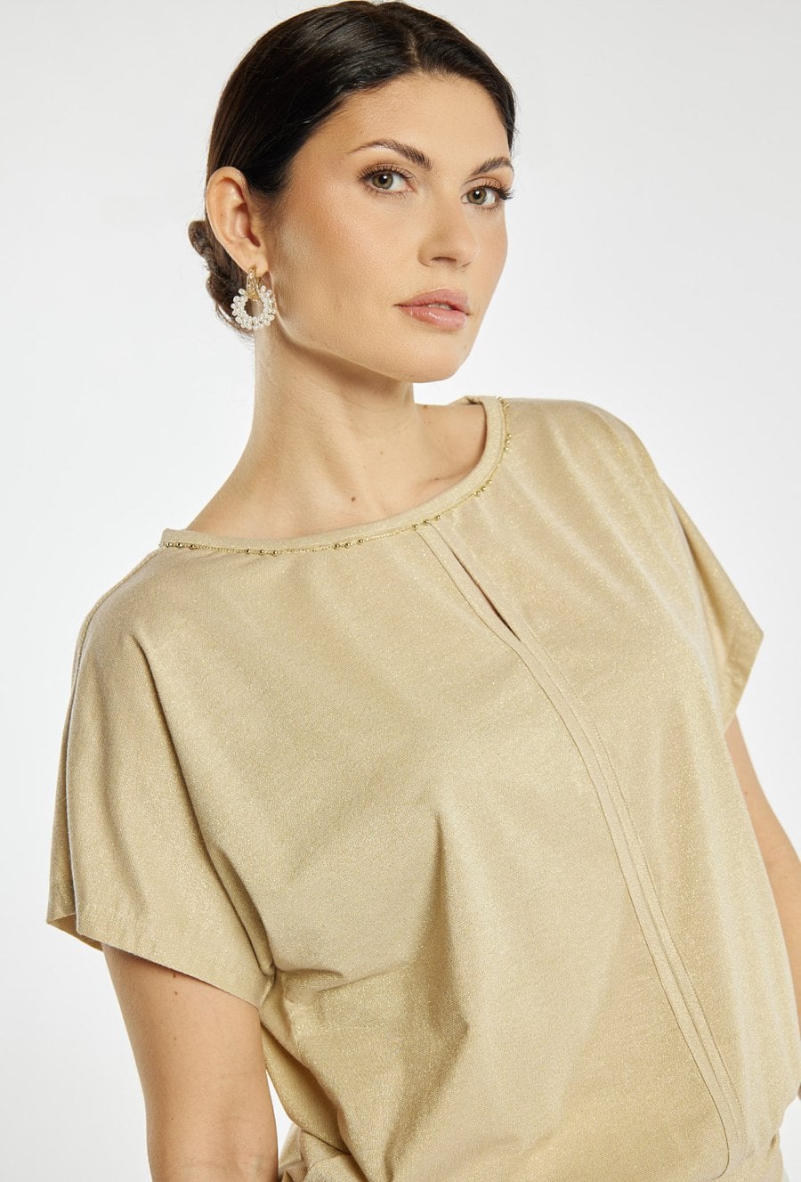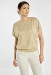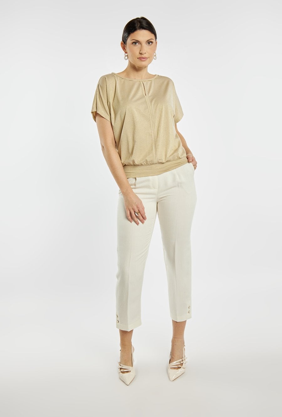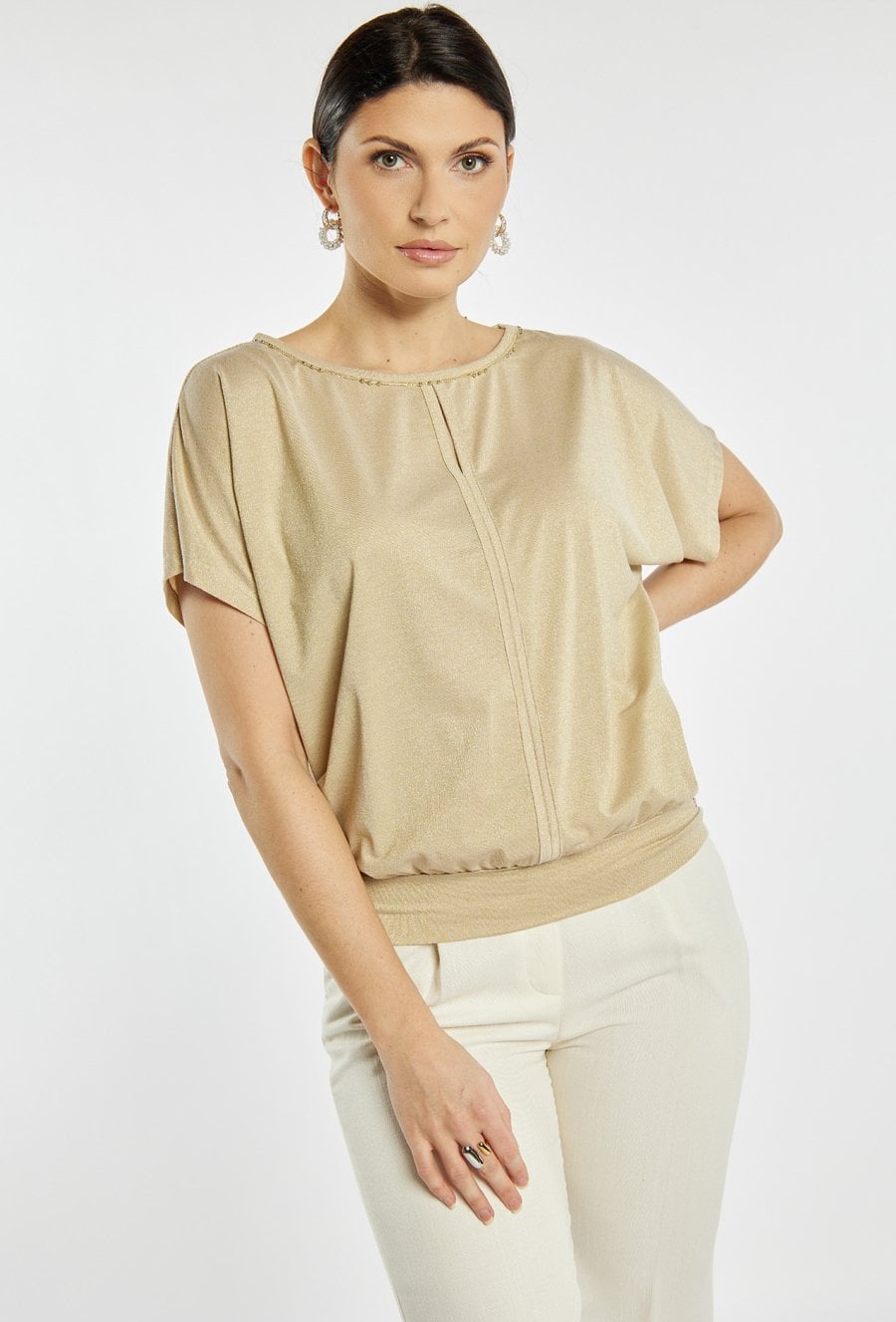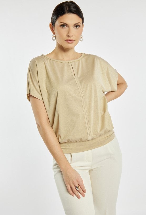 Bluzka damska o luźnym, swobodnym kroju. Model z krótkim, szerokim rękawem oraz półokrągłym dekoltem wykończonym subtelną lamówką. Dół zakończony elastycznym ściągaczem, który zapewnia dobre dopasowanie i podkreśla sylwetkę. Modelka na zdjęciu ma 177 cm wzrostu i prezentuje rozmiar S.