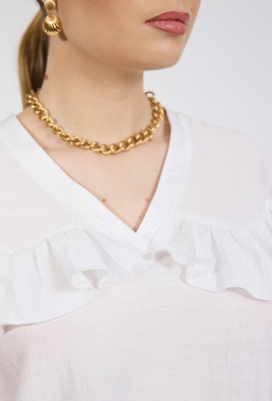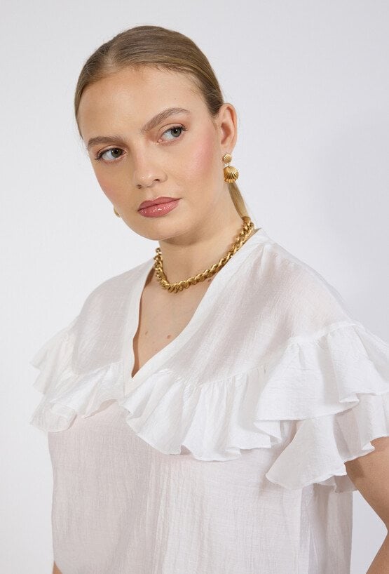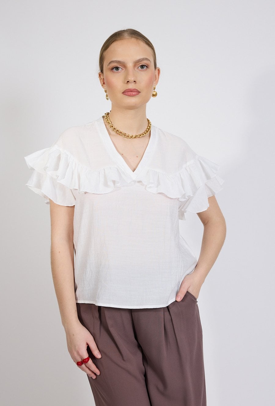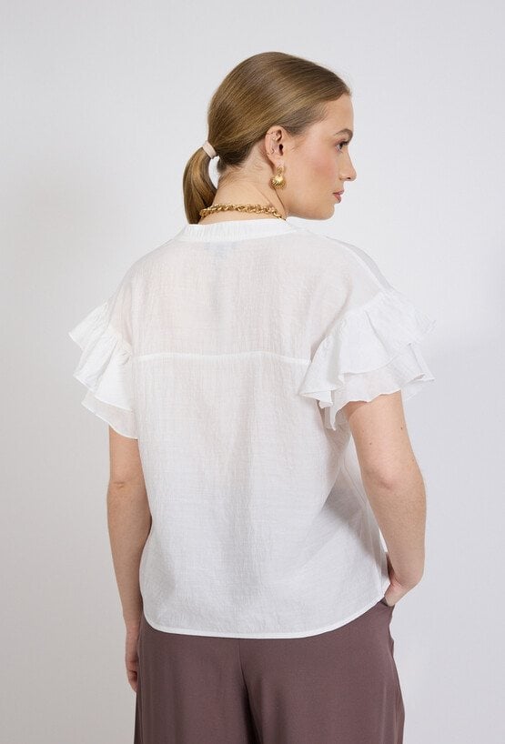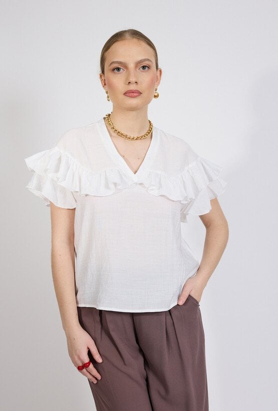 Bluzka damska o lekkim, kobiecym kroju. Model z krótkim rękawem oraz dekoltem w kształcie litery V, który subtelnie podkreśla linię szyi. Górną część zdobi efektowna falbana biegnąca przez przód i rękawy. Modelka na zdjęciu ma 177 cm wzrostu i prezentuje rozmiar 36.