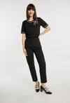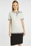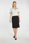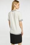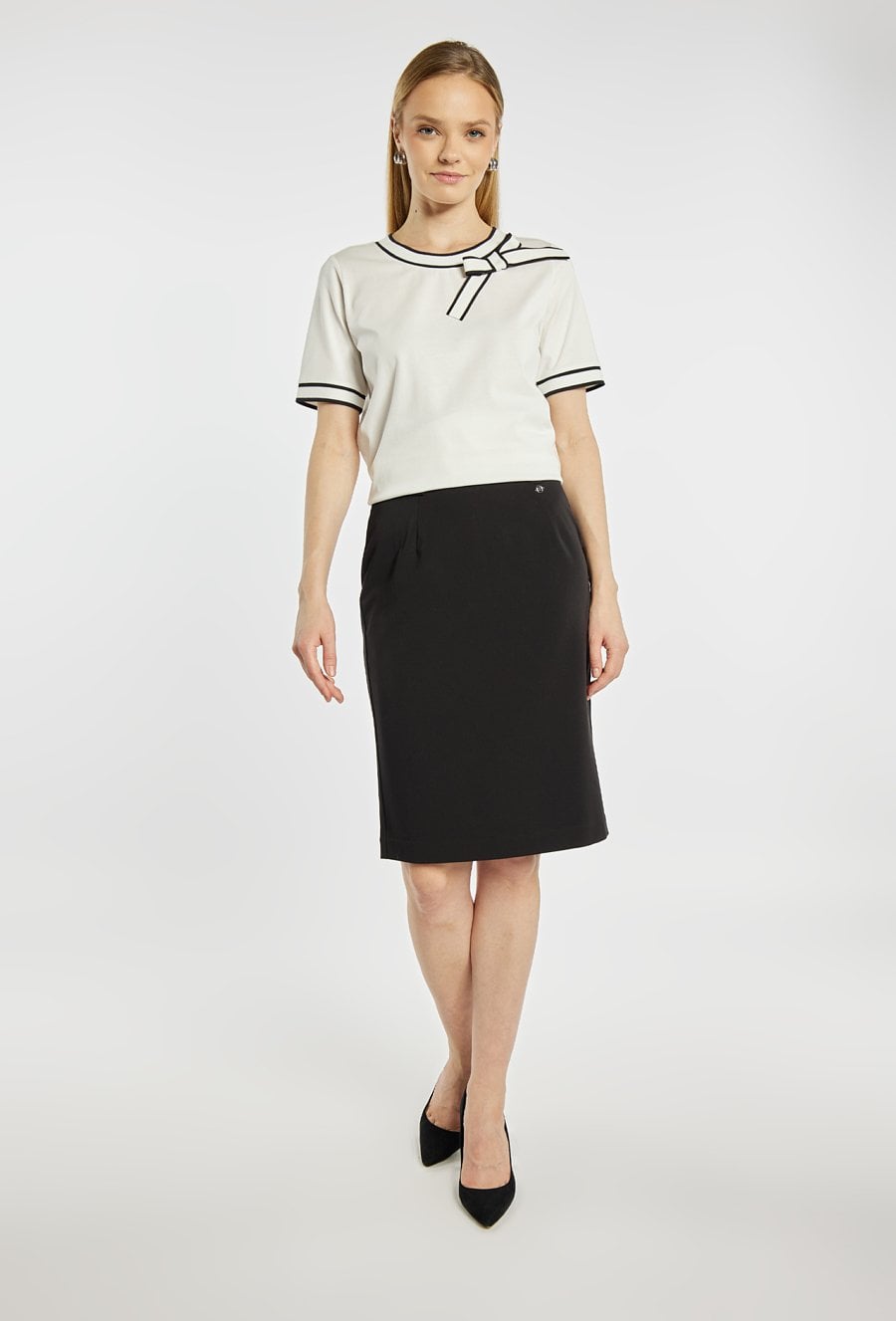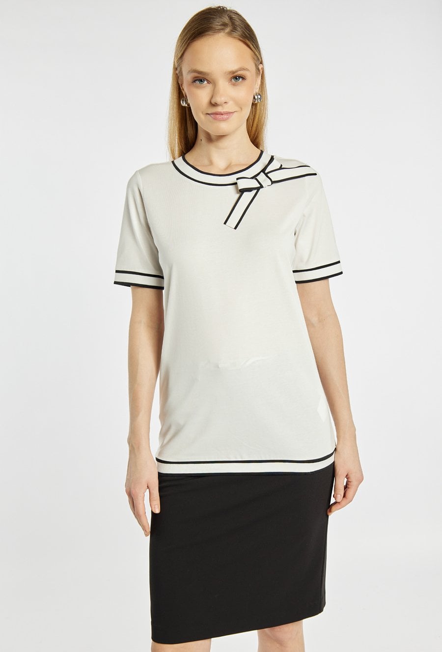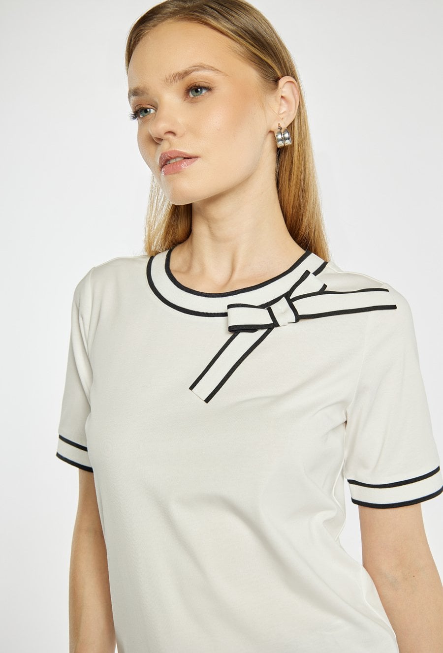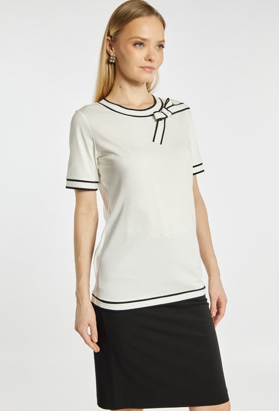 Bluzka z krótkim rękawem wyróżnia się kontrastowymi lamówkami oraz dekoracyjną kokardką przy dekolcie, która dodaje jej szykownego, kobiecego charakteru. Model idealny do pracy, na spotkania oraz do klasycznych stylizacji. Modelka na zdjęciu ma 177 cm wzrostu i prezentuje rozmiar S.
