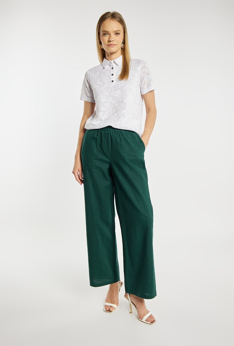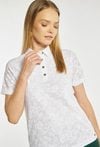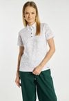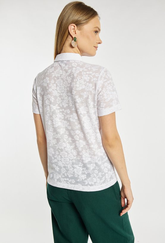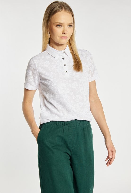Koszulka damska typu polo o dopasowanym, klasycznym kroju z krótkim rękawem. Model z kołnierzykiem oraz zapięciem na guziki, które nadają całości eleganckiego, sportowego charakteru. Całość zdobi subtelny, tłoczony wzór kwiatowy, dodający delikatności i kobiecego stylu. Modelka na zdjęciu ma 177 cm wzrostu i prezentuje rozmiar S.