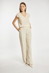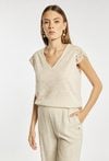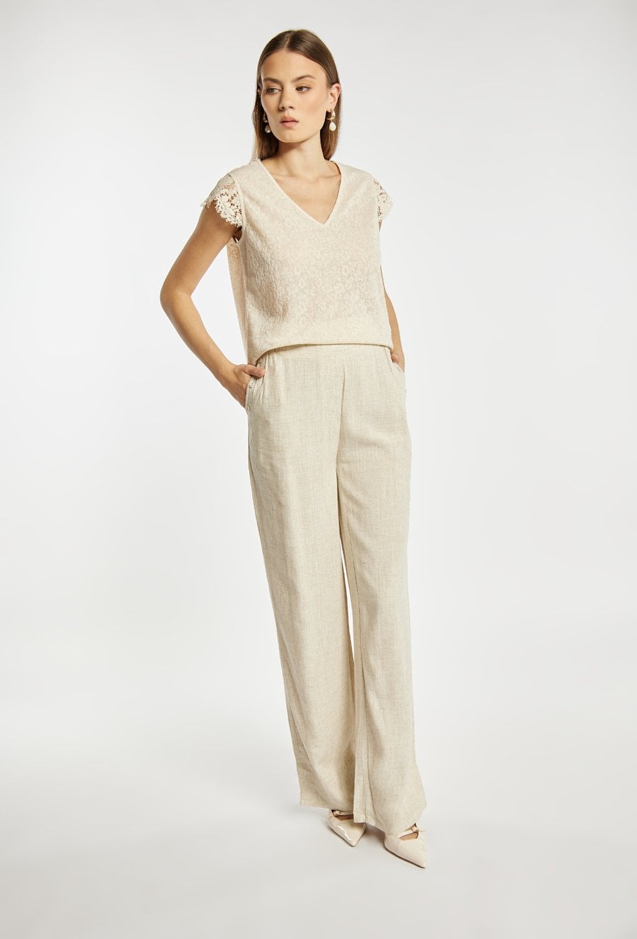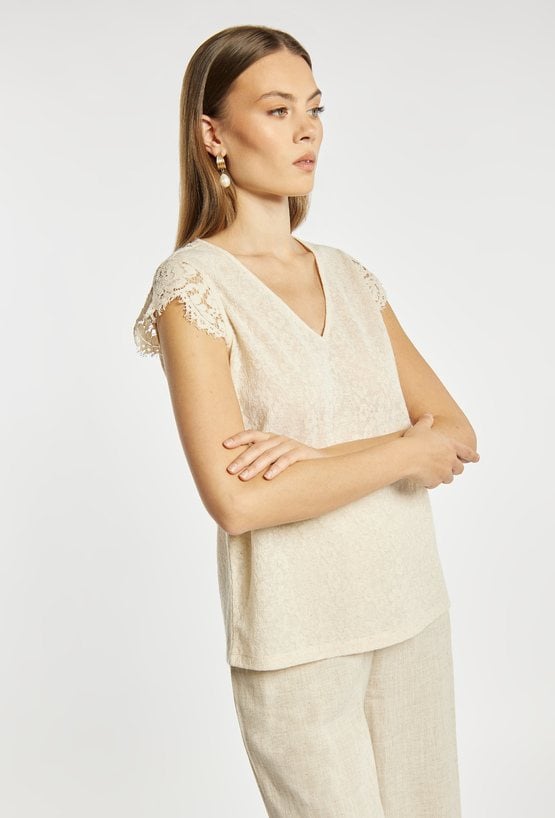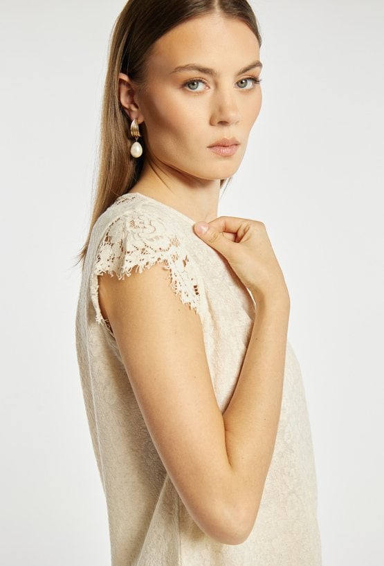 Bluzka damska o lekkim, eleganckim kroju bez rękawów. Model z dekoltem w kształcie litery V, który subtelnie podkreśla linię szyi. Delikatnie strukturalny materiał dodaje stylizacji subtelnej elegancji. Idealna zarówno do codziennych, jak i bardziej stylowych zestawień. Modelka na zdjęciu ma 177 cm wzrostu i prezentuje rozmiar S.