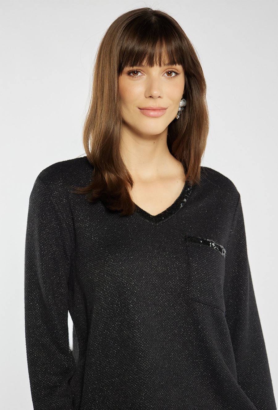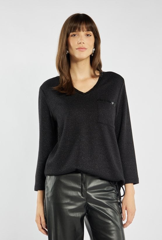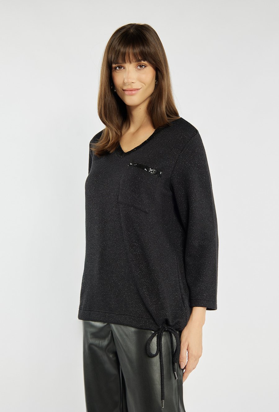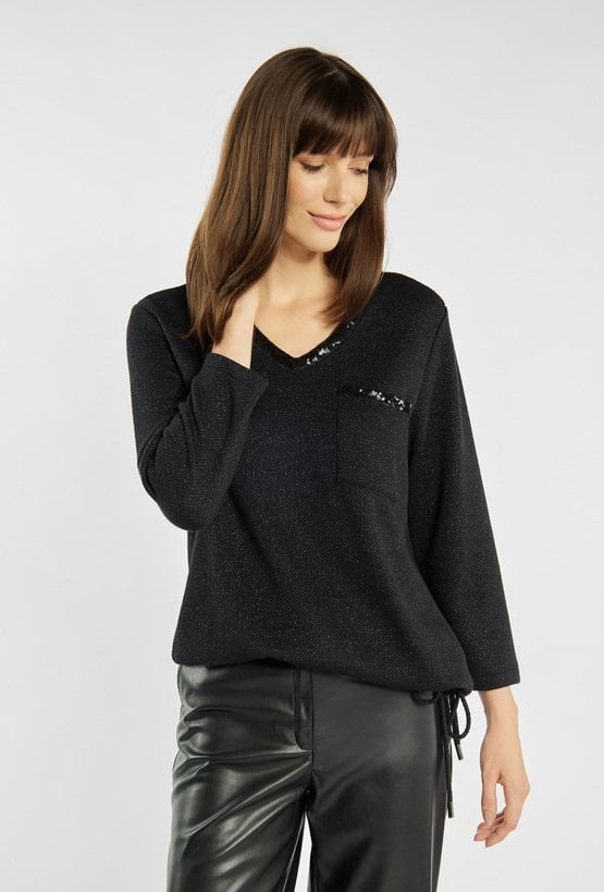 Bluzka z delikatnym połyskiem, ozdobiona subtelnymi aplikacjami z cekinów przy dekolcie i na kieszeni. Model o prostym kroju z dekoltem w serek i rękawem 3/4, zakończony troczkami po bokach, które umożliwiają regulację długości. Idealna propozycja na święta, sylwestra lub wieczorne spotkania. Modelka na zdjęciu ma 177 cm wzrostu i prezentuje rozmiar S.