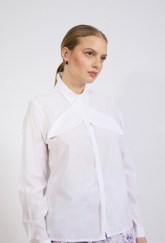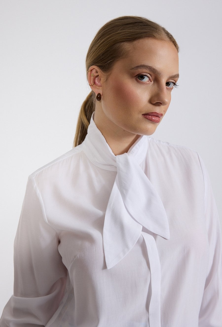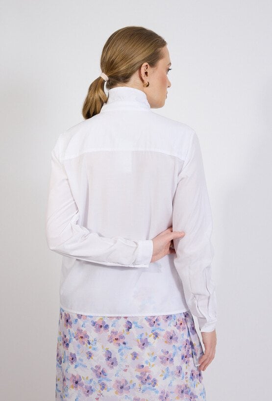 Bluzka damska o eleganckim, klasycznym kroju. Model z długim rękawem oraz stójką wykończoną dekoracyjnym wiązaniem, które nadaje całości szykownego i kobiecego charakteru. Bluzka damska doskonale sprawdzi się w stylizacjach biurowych oraz wizytowych. Modelka na zdjęciu ma 177 cm wzrostu i prezentuje rozmiar 36.