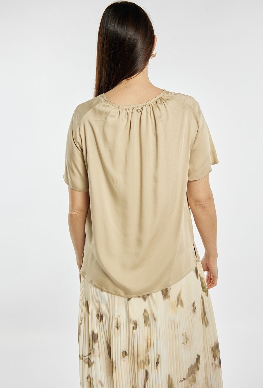 Bluzka damska o swobodnym, lekkim kroju. Model z krótkim rękawem oraz okrągłym dekoltem z ozdobnym wiązaniem i subtelnymi detalami przy wycięciu. Bluzka świetnie komponuje się zarówno ze spodniami, jak i spódnicą, tworząc elegancki, a zarazem swobodny look. Modelka na zdjęciu ma 177 cm wzrostu i prezentuje rozmiar S.