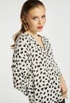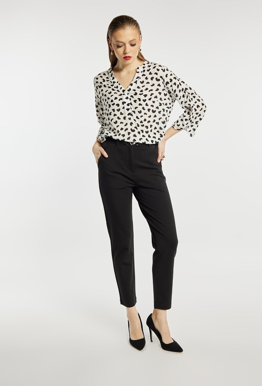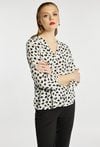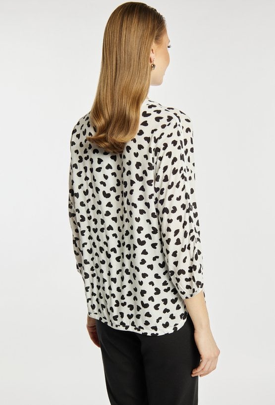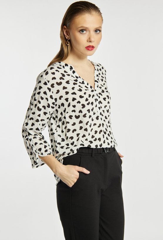 Bluzka damska wykonana z lekkiego, zwiewnego materiału. Bluzka z dekoltem w serek i rękawem 3/4 wyróżnia się modnym, drobnym wzorem w kontrastowych kolorach, który dodaje stylizacji charakteru. Luźniejszy krój zapewnia komfort noszenia, a model świetnie sprawdza się zarówno w codziennych, jak i bardziej eleganckich zestawach. Modelka na zdjęciu ma 177 cm wzrostu i prezentuje rozmiar 36.