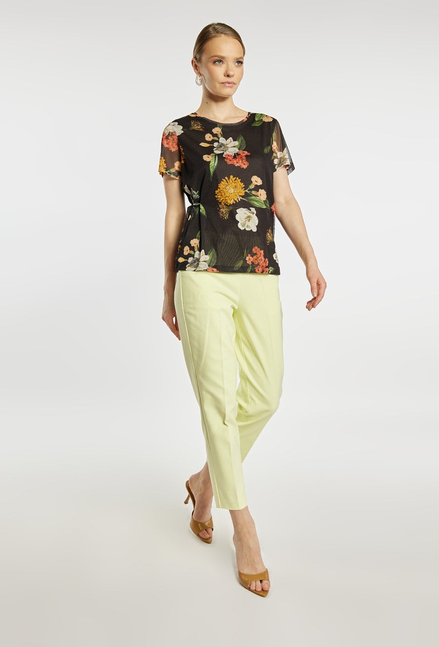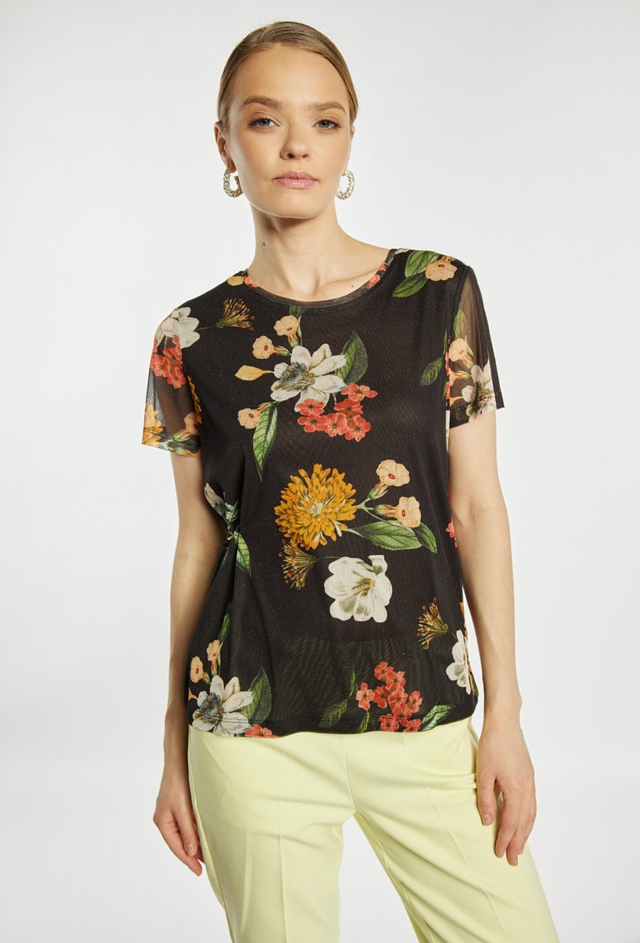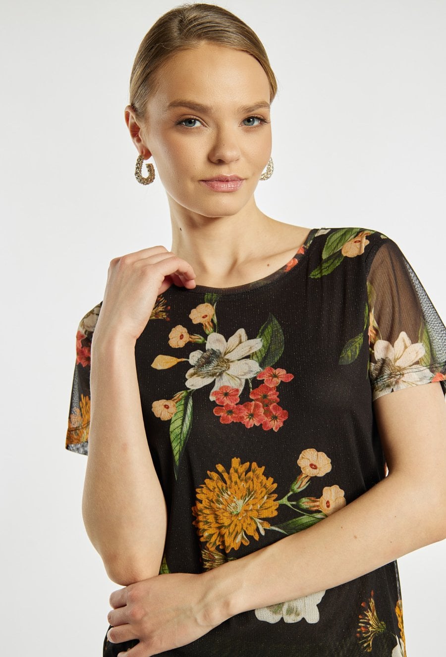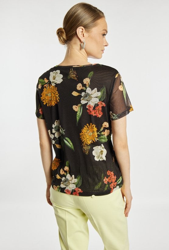 Bluzka damska o lekkim, swobodnym kroju. Model z krótkim rękawem oraz klasycznym, okrągłym dekoltem. Tkaninę zdobi wyrazisty, kwiatowy wzór, który nadaje całości kobiecego i efektownego charakteru. Bluzka damska w kwiaty doskonale sprawdzi się w codziennych stylizacjach oraz w bardziej eleganckich zestawach. Modelka na zdjęciu ma 177 cm wzrostu i prezentuje rozmiar S.