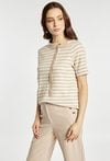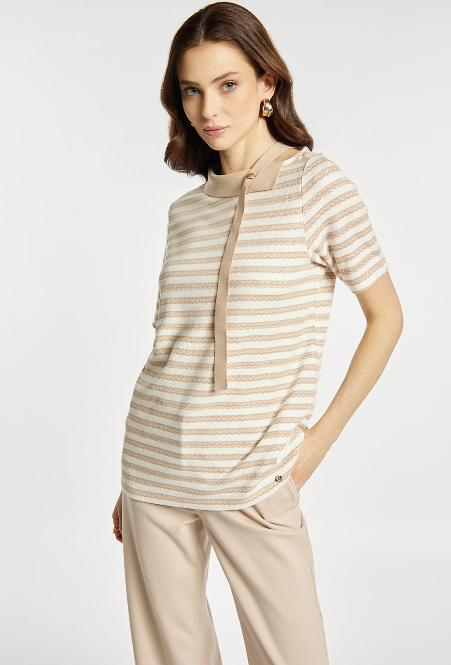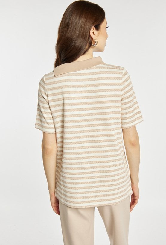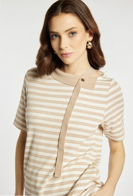 Bluzka damska wykonana z lekkiego, przyjemnego w dotyku materiału. Bluzka z krótkim rękawem i wzorem w delikatne paski wyróżnia się kontrastową listwą biegnącą od kołnierzyka oraz ozdobnym guzikiem, co nadaje jej nowoczesnego i eleganckiego charakteru. Model idealny do stylizacji biznesowych i codziennych. Modelka na zdjęciu ma 177 cm wzrostu i prezentuje rozmiar S.