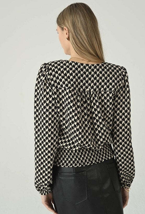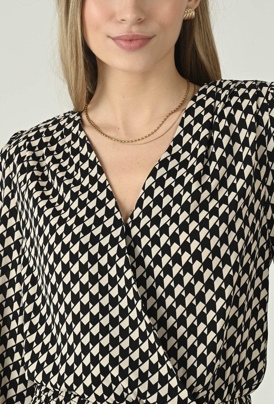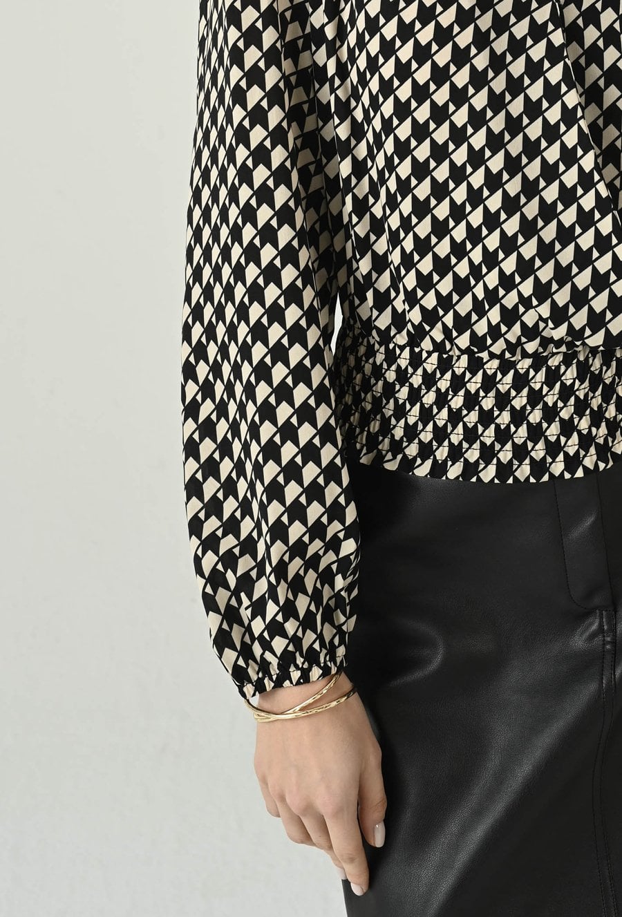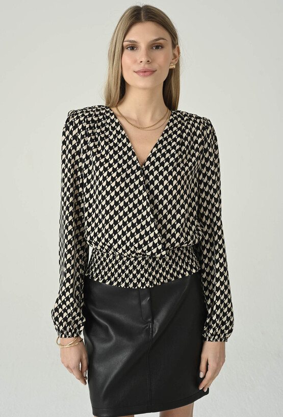 Wyrazista bluzka w czarno-ecru drobny wzór, która pięknie podkreśla sylwetkę i dodaje stylizacji elegancji. Kopertowy przód z dekoltem w kształcie litery V tworzy kobiecą linię, a dopasowanie w talii akcentuje proporcje i nadaje całości lekkiego, szykownego charakteru. Długie rękawy z delikatnym marszczeniem przy mankiecie dodają subtelnej objętości i sprawiają, że model prezentuje się wyjątkowo stylowo. To idealna propozycja do biura, na spotkania i wieczorne wyjścia — świetnie wygląda zarówno ze spódnicą, jak i ze spodniami o podwyższonym stanie.
