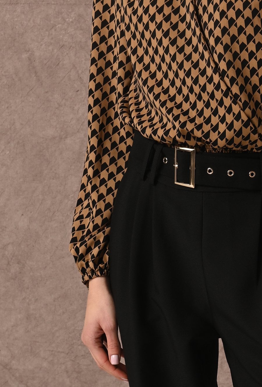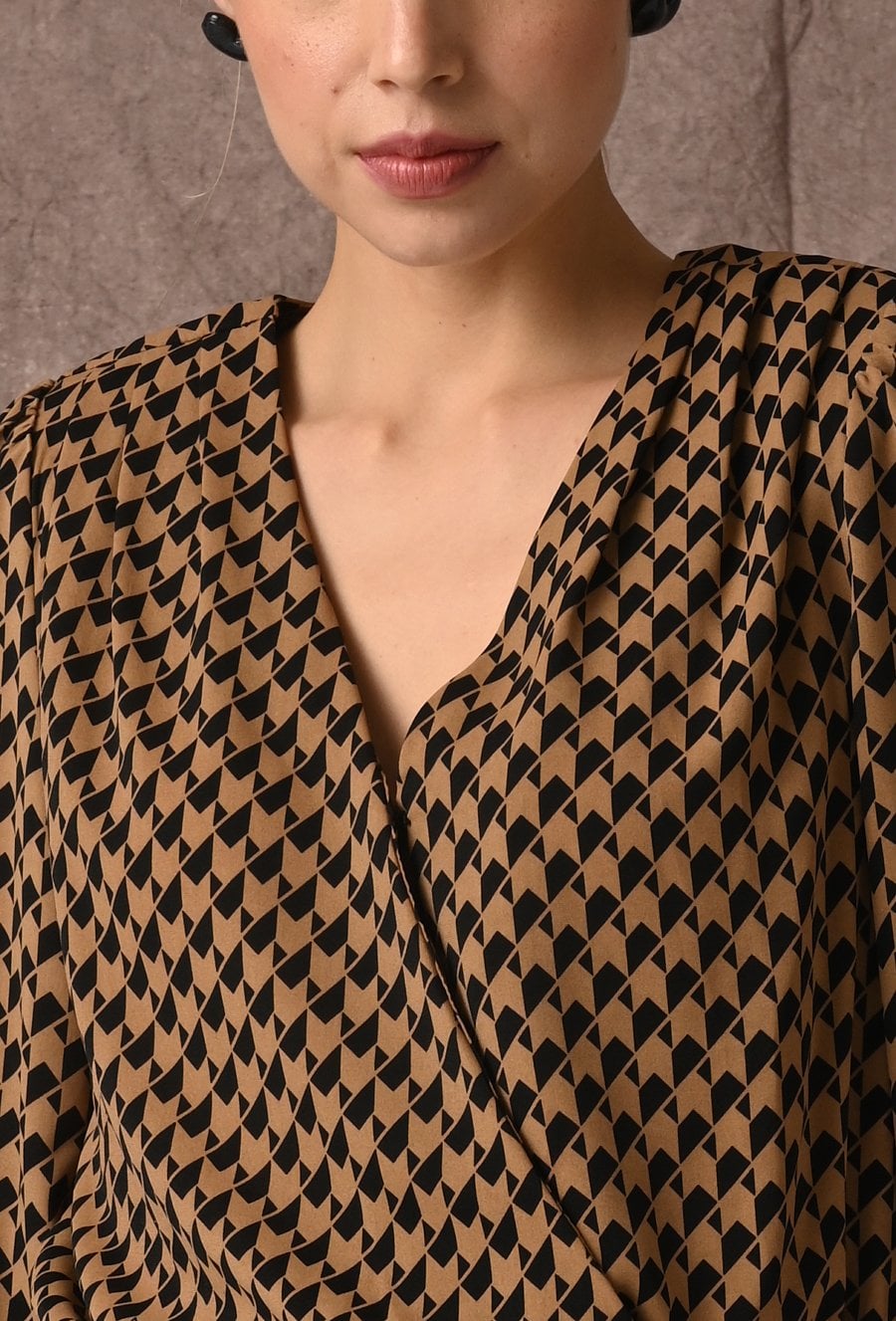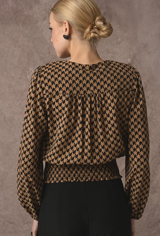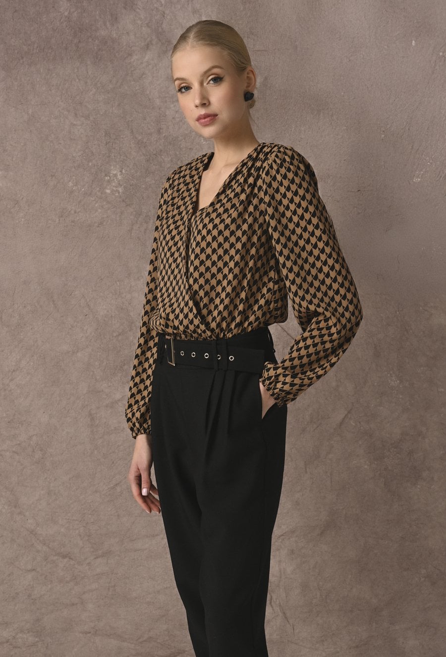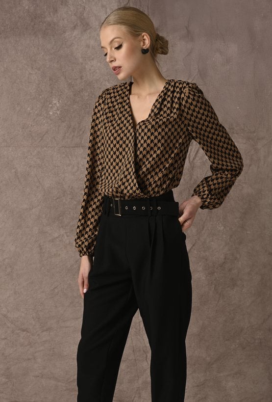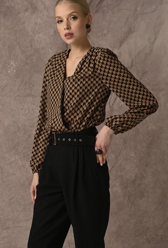 Elegancka bluzka w brązowo-czarny wzór, która dodaje stylizacji wyrazistości, zachowując przy tym kobiecą lekkość. Kopertowy przód z dekoltem w kształcie litery V pięknie podkreśla szyję i optycznie wysmukla sylwetkę, a luźniejsza forma zapewnia komfort noszenia przez cały dzień. Długie rękawy delikatnie budują proporcje i nadają całości szykownego charakteru. To idealny wybór do spodni z wysokim stanem lub spódnicy — sprawdzi się zarówno w biurowych zestawach, jak i w stylizacjach na wieczorne wyjścia.