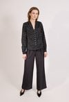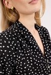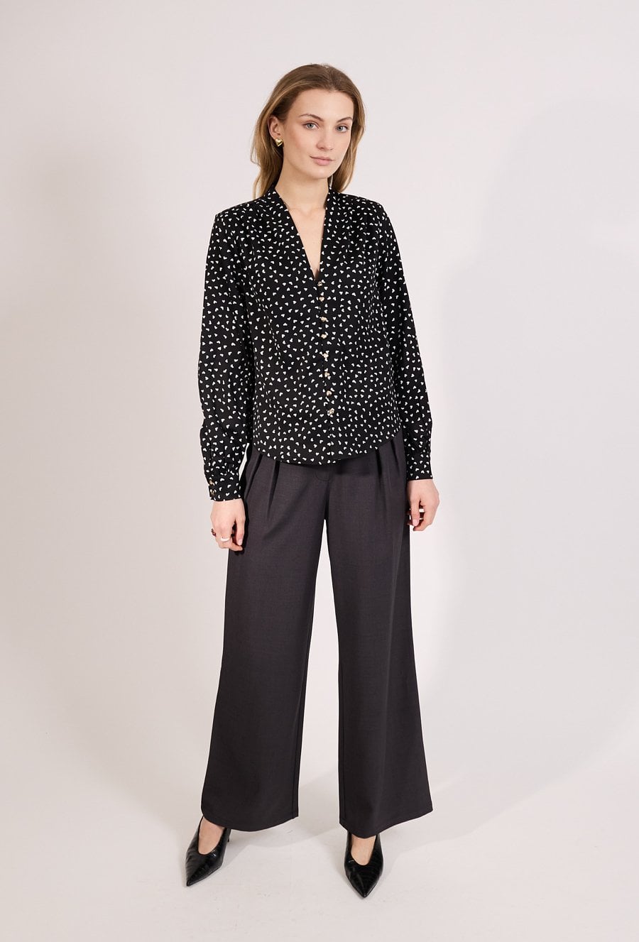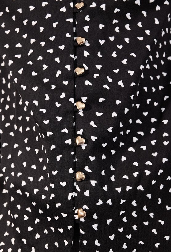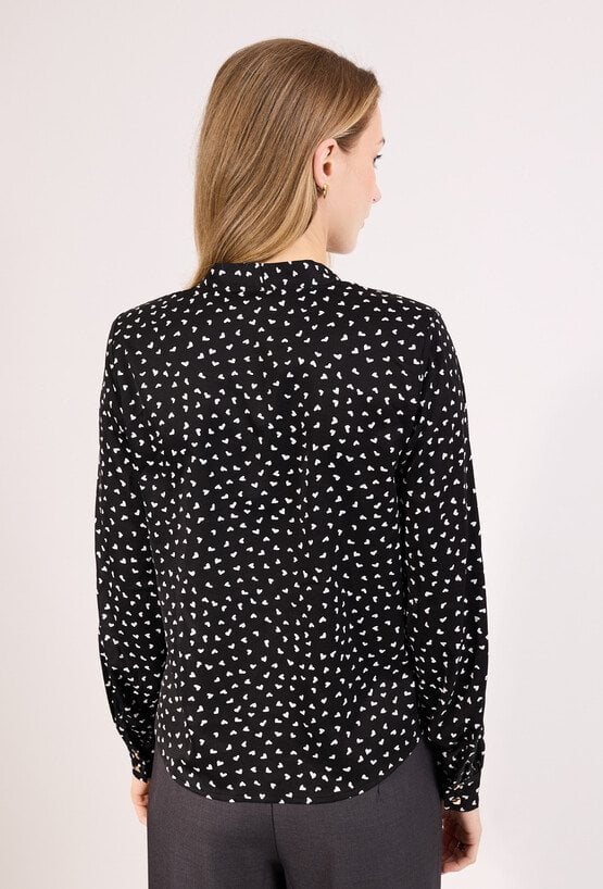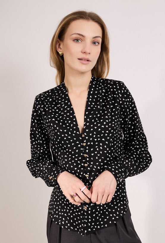 Stylowa bluzka damska o dopasowanym kroju z długim rękawem. Model zapinany na guziki z dekoltem w kształcie litery V, ozdobiony subtelnym wzorem w serduszka. Bluzka doskonale sprawdzi się w eleganckich i codziennych stylizacjach, do pracy oraz na spotkania. Modelka na zdjęciu ma 177 cm wzrostu i prezentuje rozmiar 36.