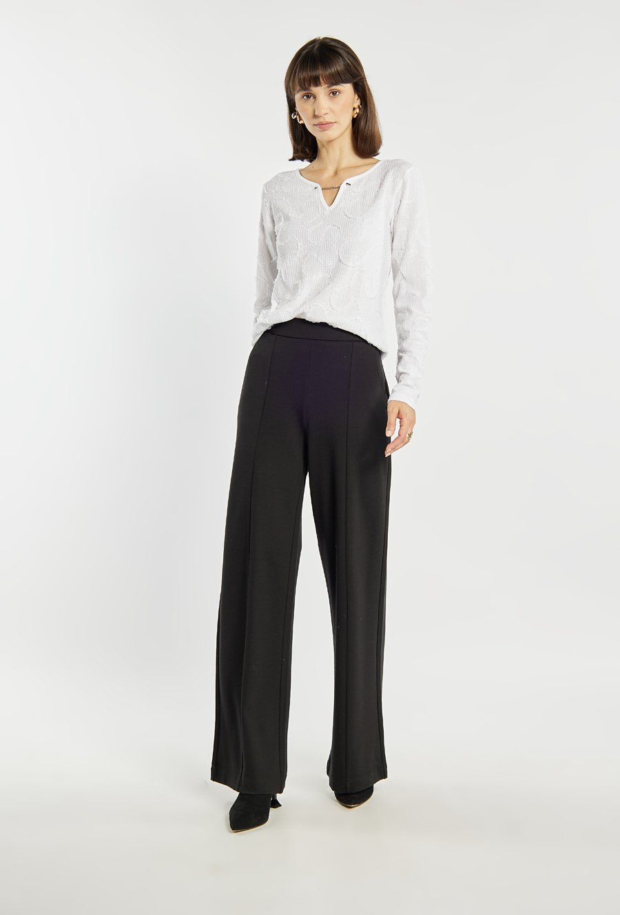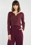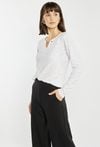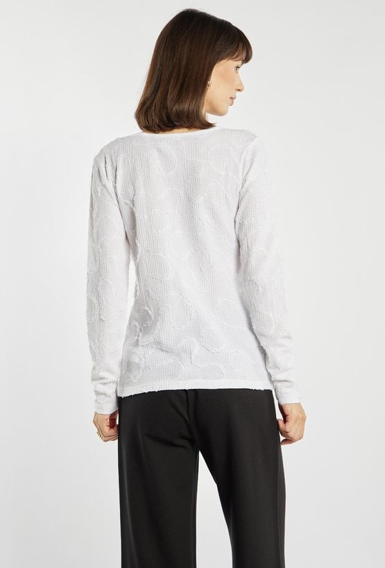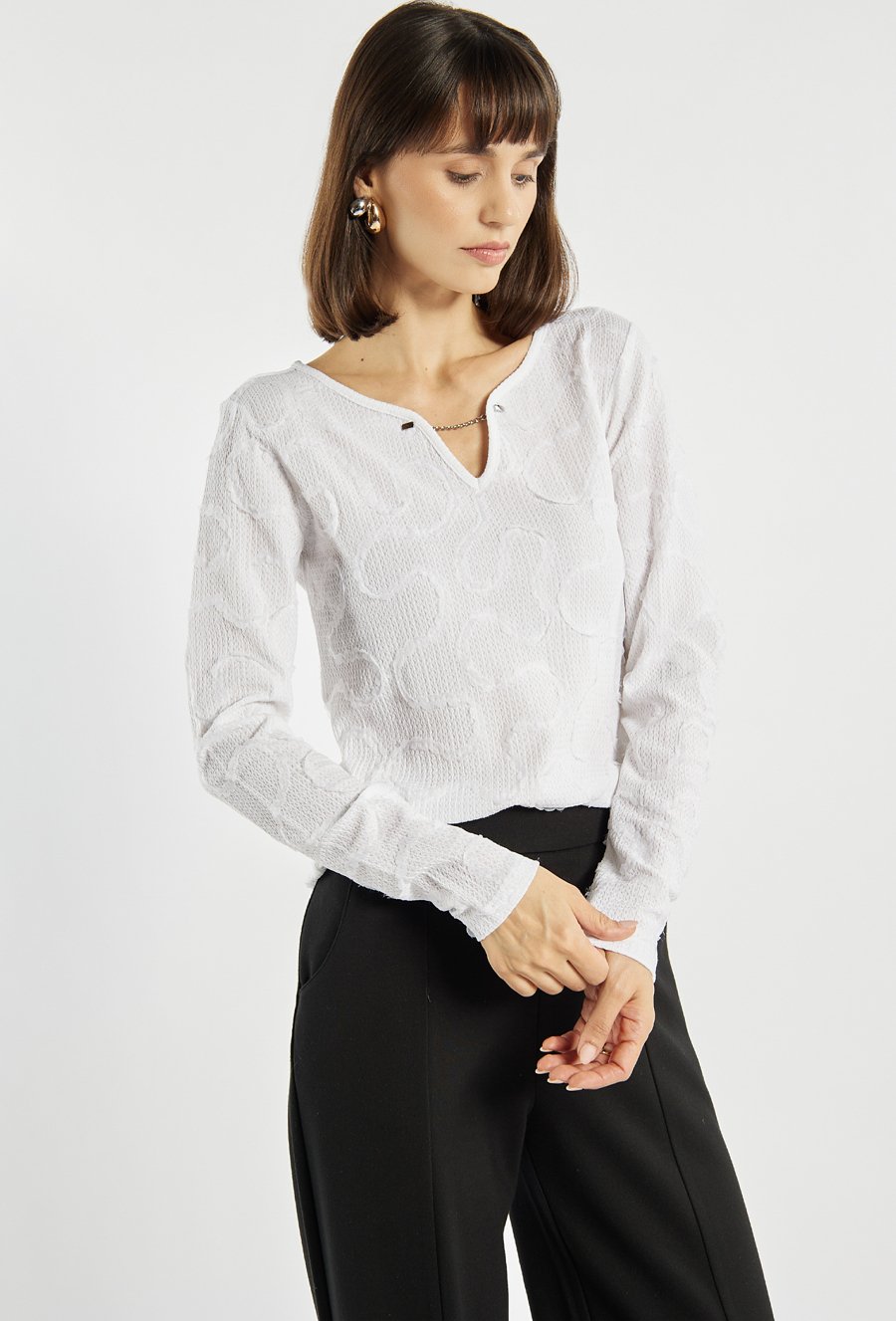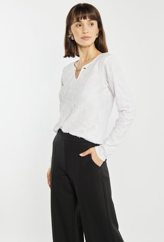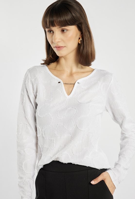 Bluzka damska z długim rękawem i subtelnym, tłoczonym wzorem na całej powierzchni. Model z delikatnym rozcięciem przy dekolcie, ozdobionym metalową wstawką. Stylowa propozycja do eleganckich i codziennych zestawień. Modelka na zdjęciu ma 177 cm wzrostu i prezentuje rozmiar S