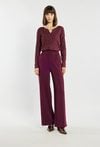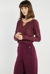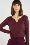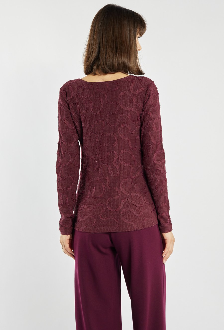 Bluzka damska z długim rękawem i subtelnym, tłoczonym wzorem na całej powierzchni. Model z delikatnym rozcięciem przy dekolcie, ozdobionym metalową wstawką. Stylowa propozycja do eleganckich i codziennych zestawień. Modelka na zdjęciu ma 177 cm wzrostu i prezentuje rozmiar S