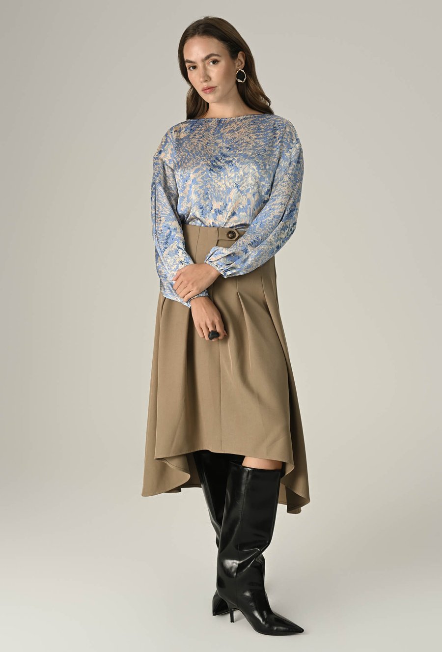 Elegancka, klasyczna damska bluzka z efektownym printem, który przyciąga wzrok. Wykonana z lekkiego materiału, doskonała do codziennych stylizacji. Bluzka posiada długie rękawy, zakończone subtelną gumką, co nadaje jej charakteru i zapewnia komfort noszenia. Uniwersalny design sprawia, że pasuje zarówno do jeansów, jak i spódnic czy spodni, idealna do pracy, na spotkania czy casualowe wyjścia. Modelka na zdjęciu ma 173 cm wzrostu i prezentuje rozmiar 36.