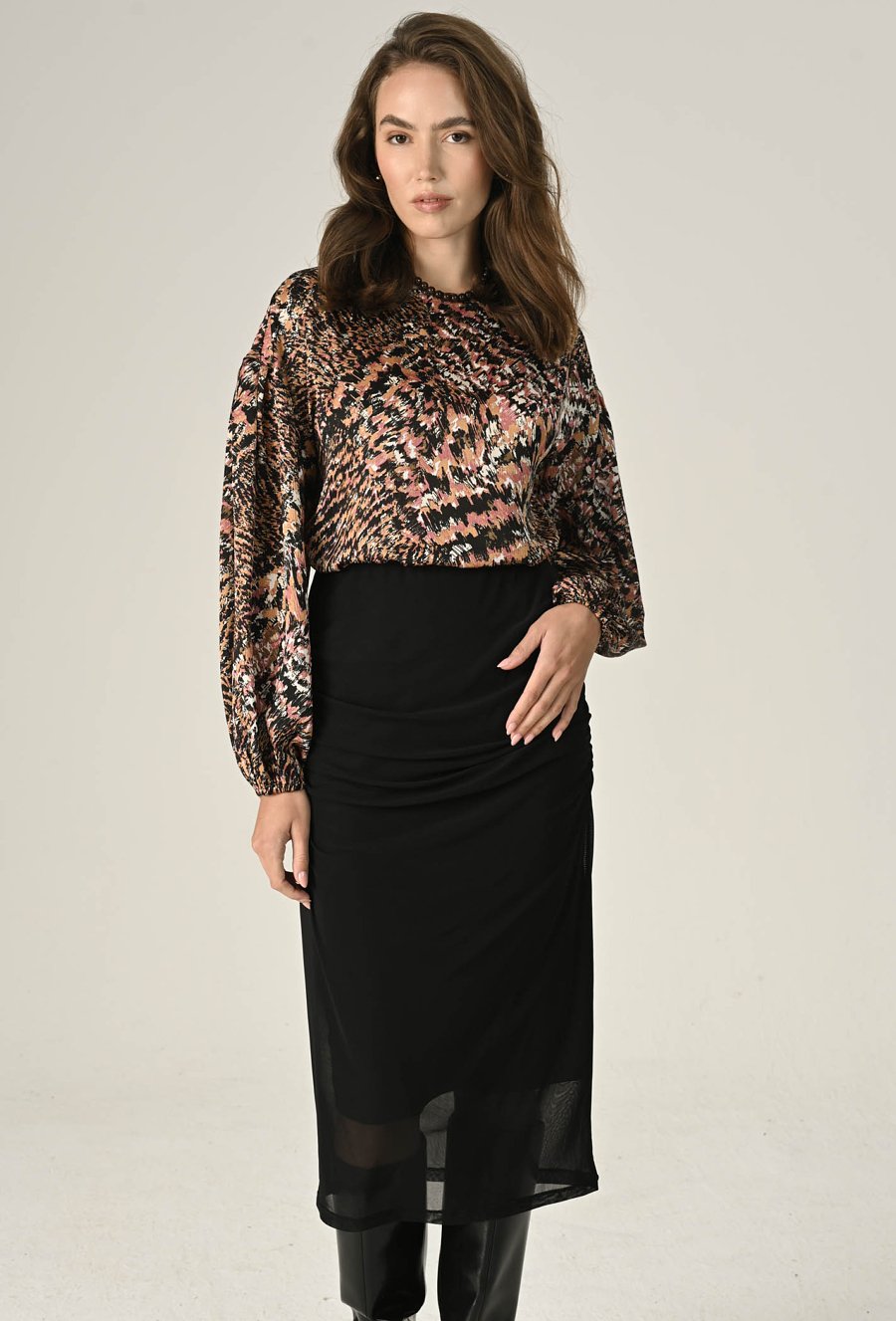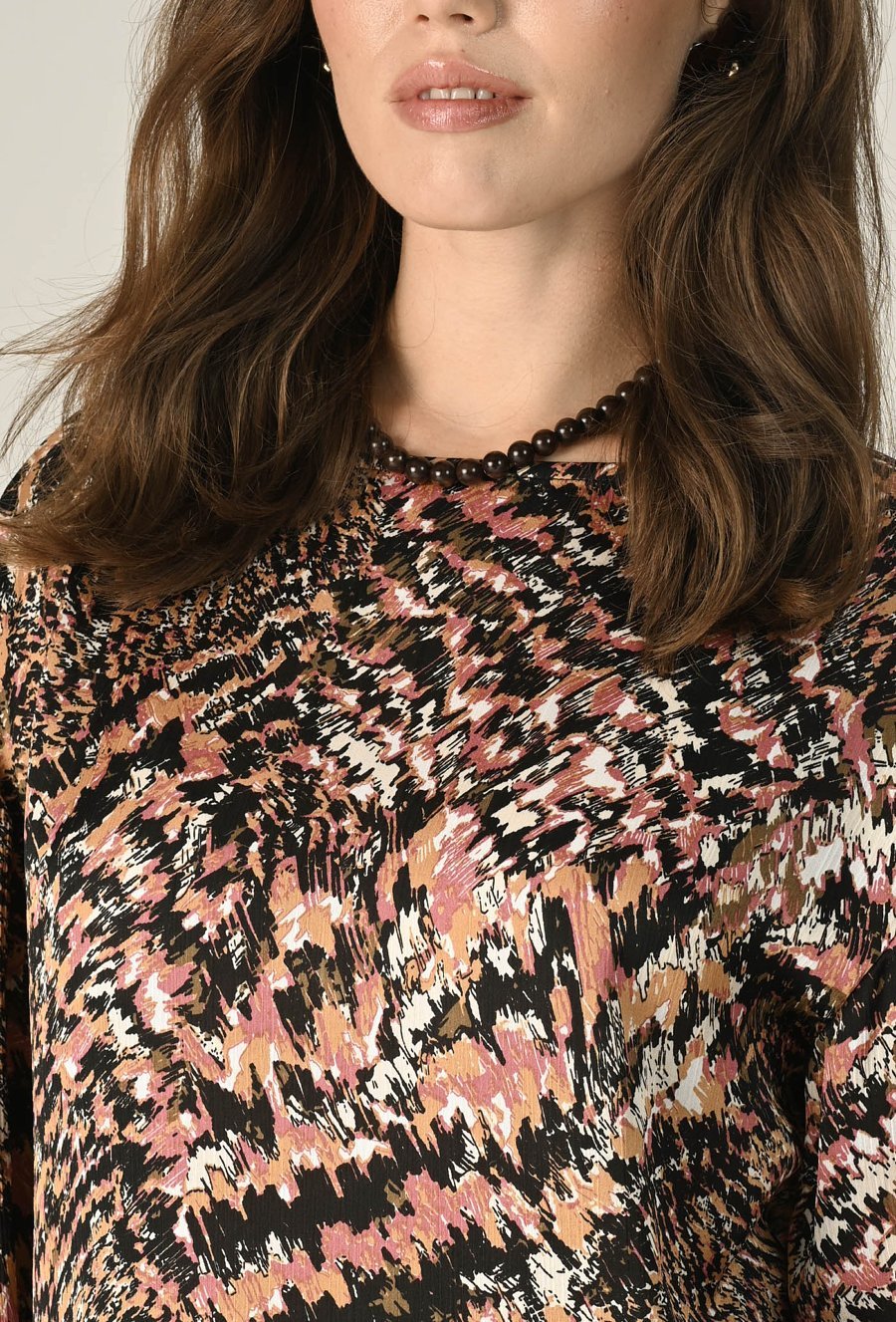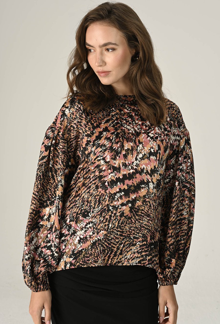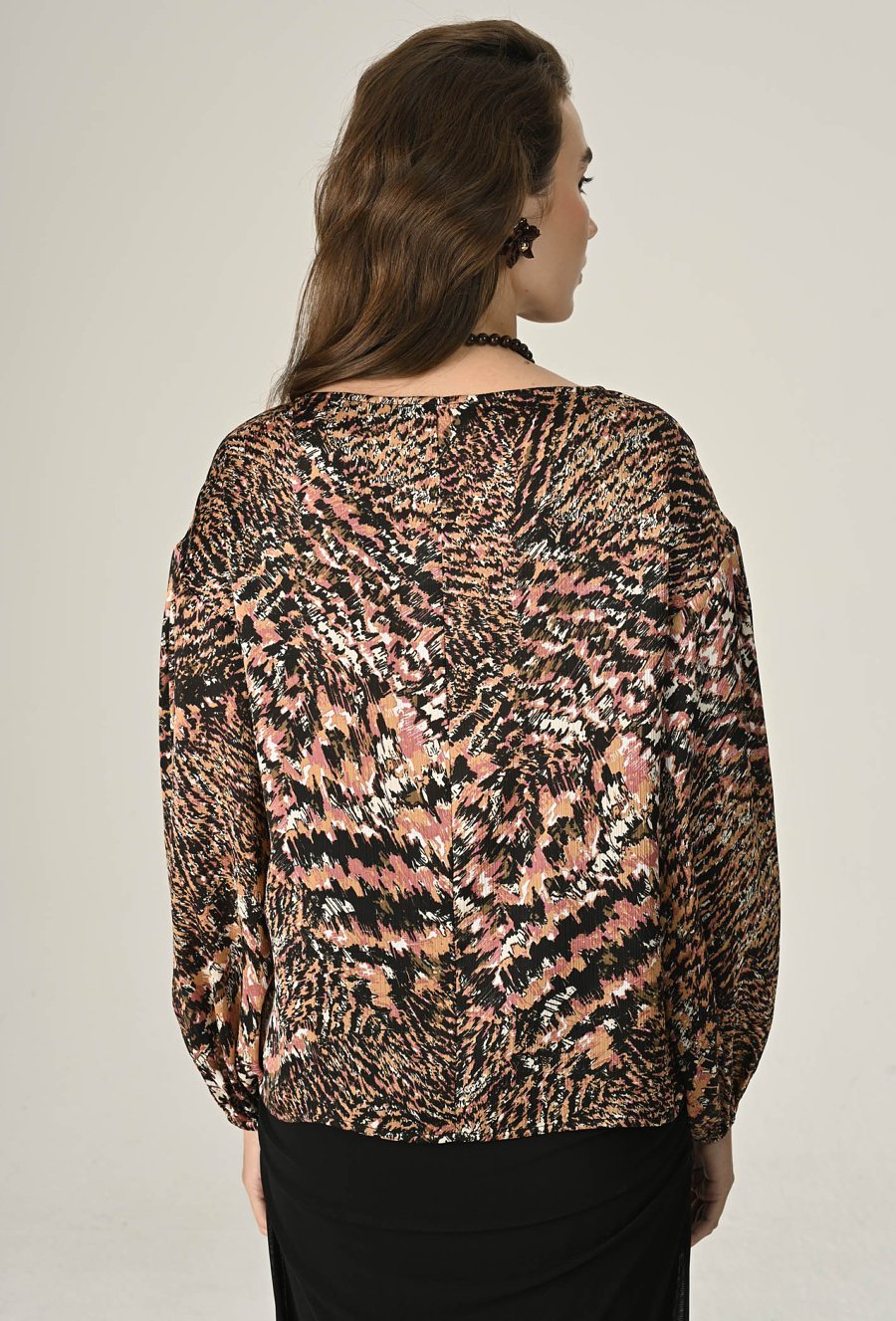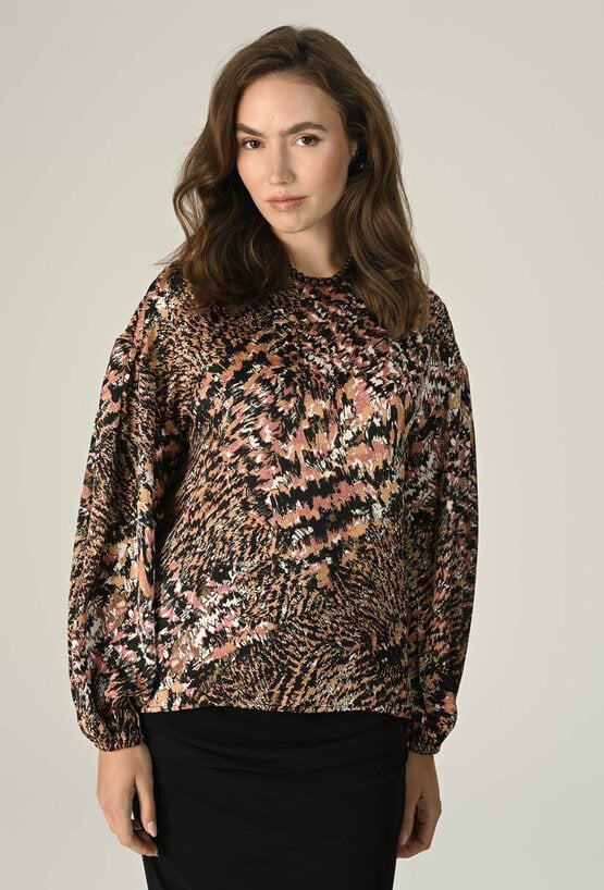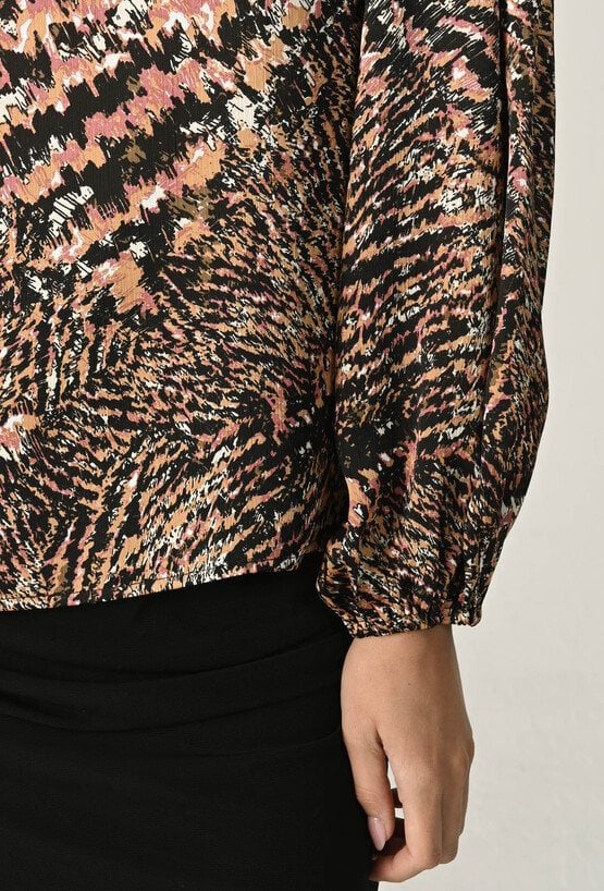 Elegancka, klasyczna damska bluzka z efektownym printem, który przyciąga wzrok. Wykonana z lekkiego materiału, doskonała do codziennych stylizacji. Bluzka posiada długie rękawy, zakończone subtelną gumką, co nadaje jej charakteru i zapewnia komfort noszenia. Uniwersalny design sprawia, że pasuje zarówno do jeansów, jak i spódnic czy spodni, idealna do pracy, na spotkania czy casualowe wyjścia. Modelka na zdjęciu ma 173 cm wzrostu i prezentuje rozmiar 36.