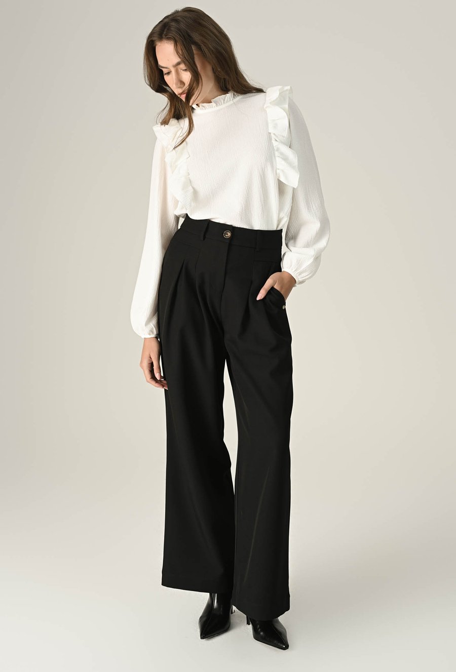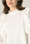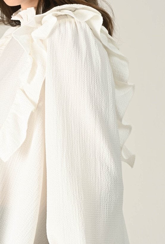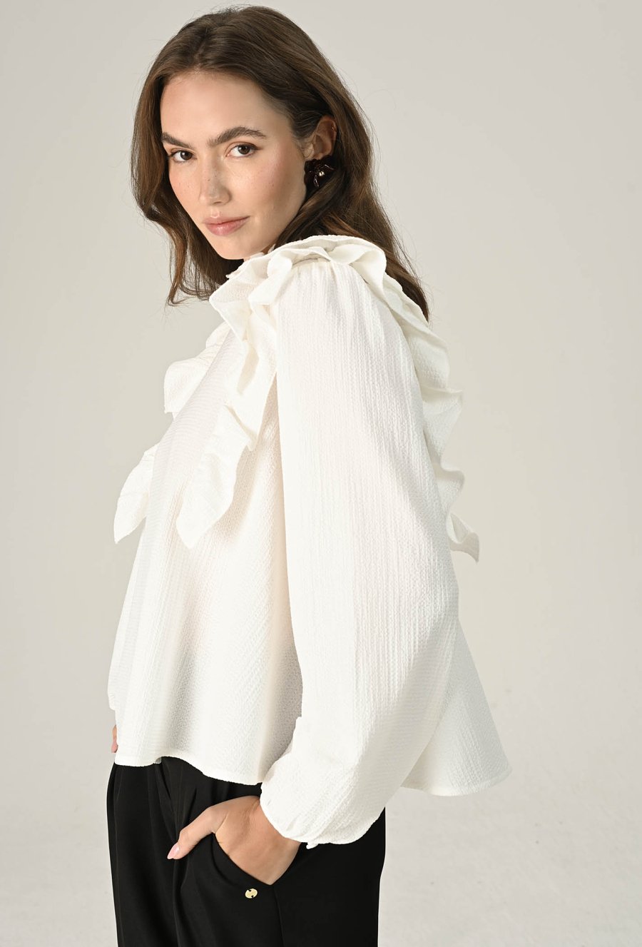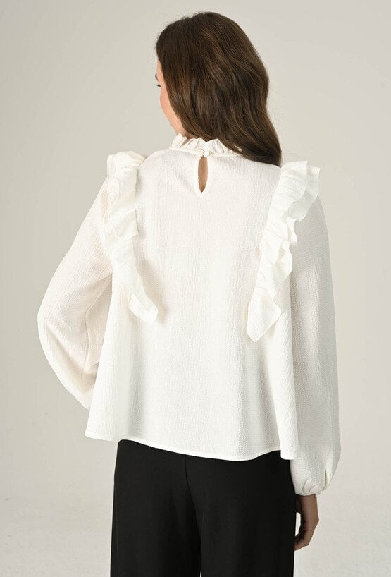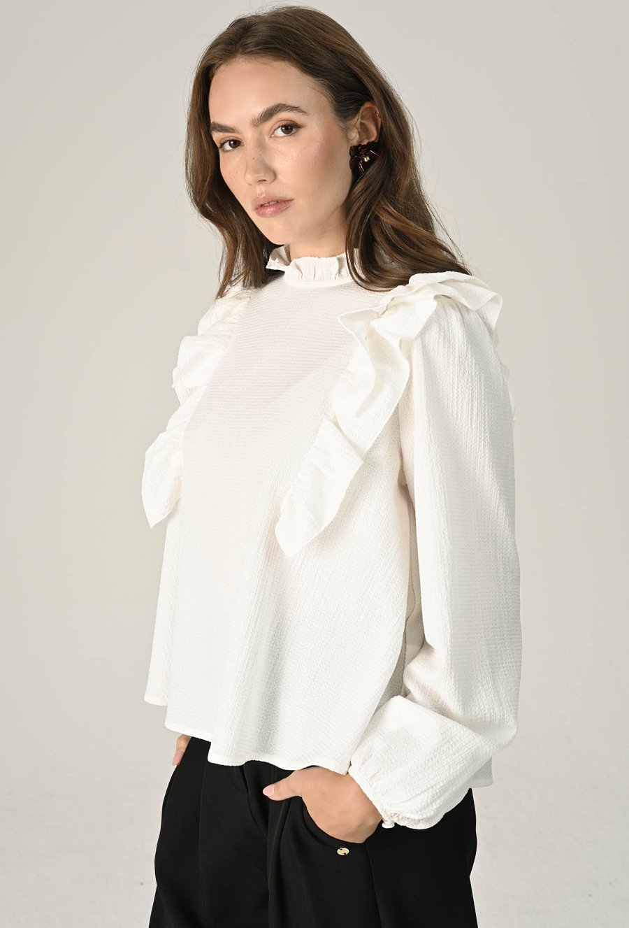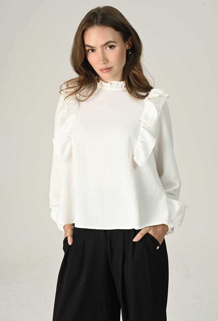 Elegancka i stylowa bluzka, wykonana z delikatnie fakturowanego materiału. Posiada długie rękawy oraz ozdobną falbanę z przodu, która dodaje jej subtelnego uroku. Zapinana z tyłu na guzik przy stójce, co podkreśla jej klasyczny charakter. Idealna jako element codziennych stylizacji — świetnie komponuje się zarówno ze spodniami, jak i spódnicą. Modelka na zdjęciu ma 174 cm wzrostu i prezentuje rozmiar 36.