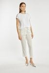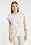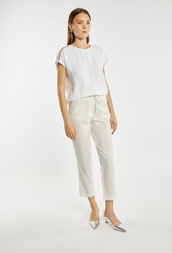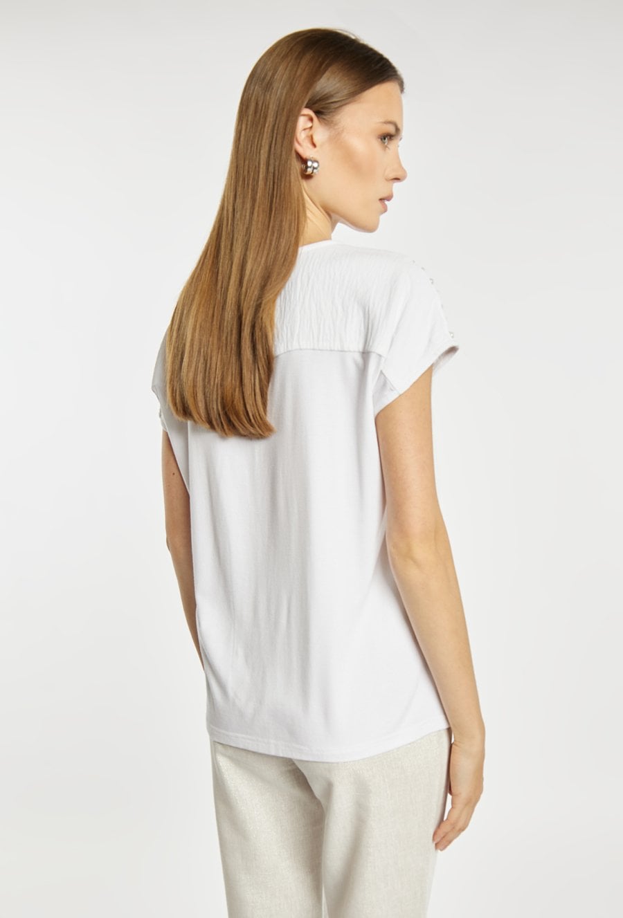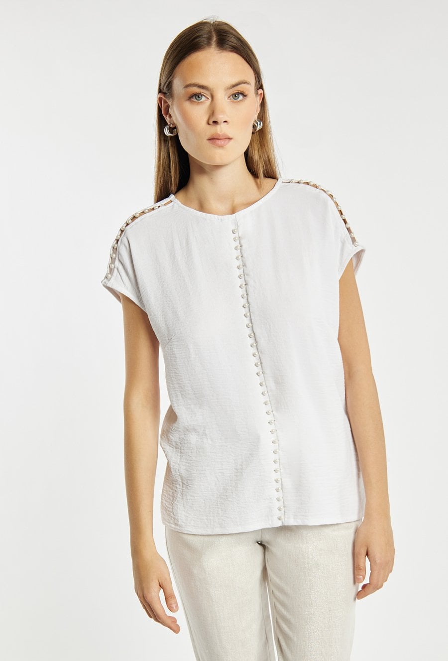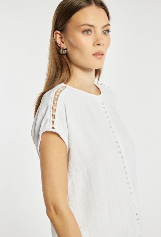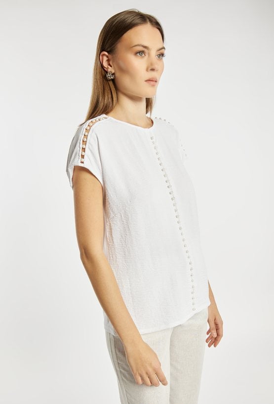 Bluzka damska o prostym, eleganckim kroju z krótkim rękawem. Model z klasycznym, okrągłym dekoltem oraz ozdobnym rzędem koralików z przodu, który nadaje całości subtelnego, biżuteryjnego charakteru. Dodatkowym atutem są dekoracyjne detale przy ramionach, podkreślające stylowy wygląd bluzki. Modelka na zdjęciu ma 177 cm wzrostu i prezentuje rozmiar S.