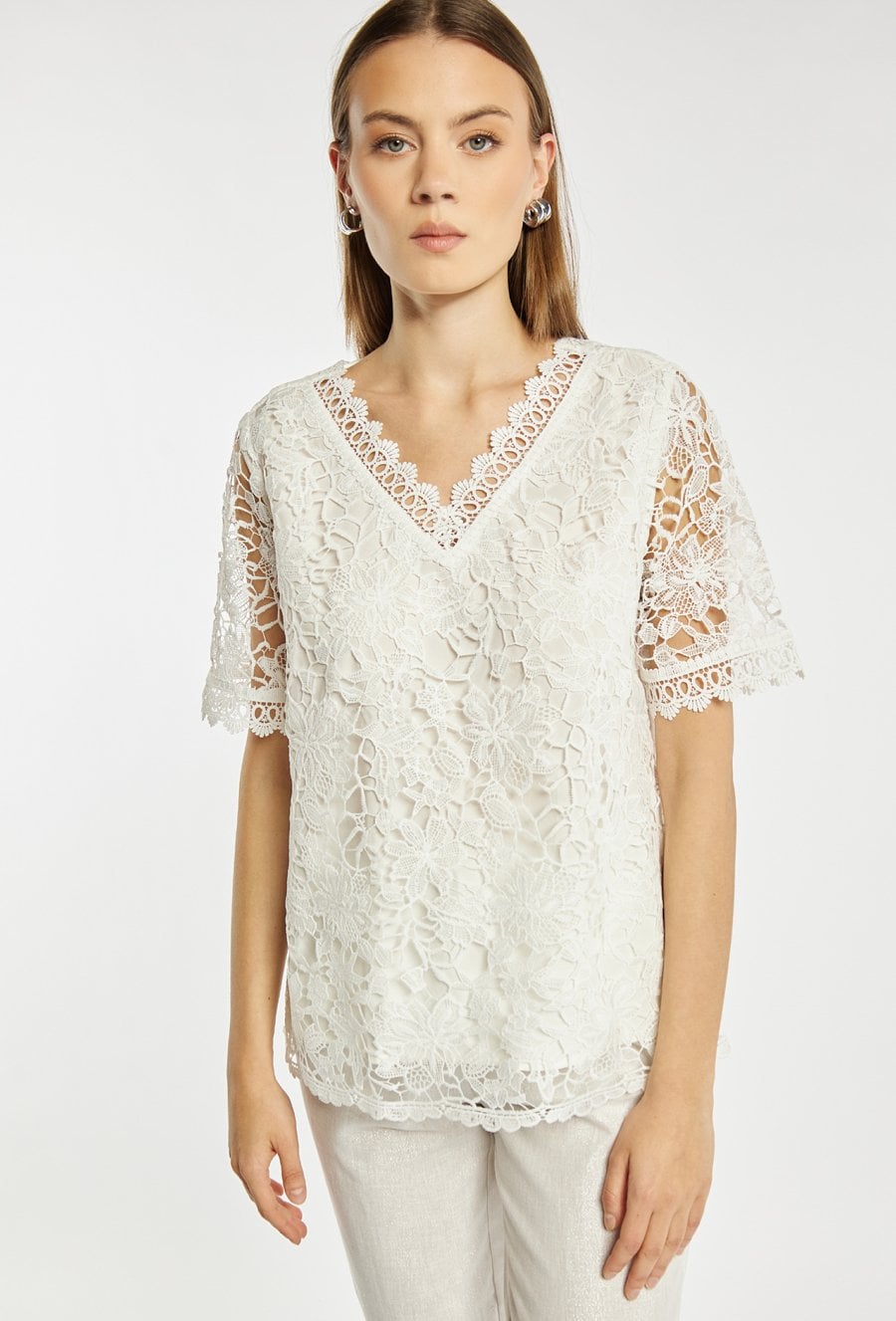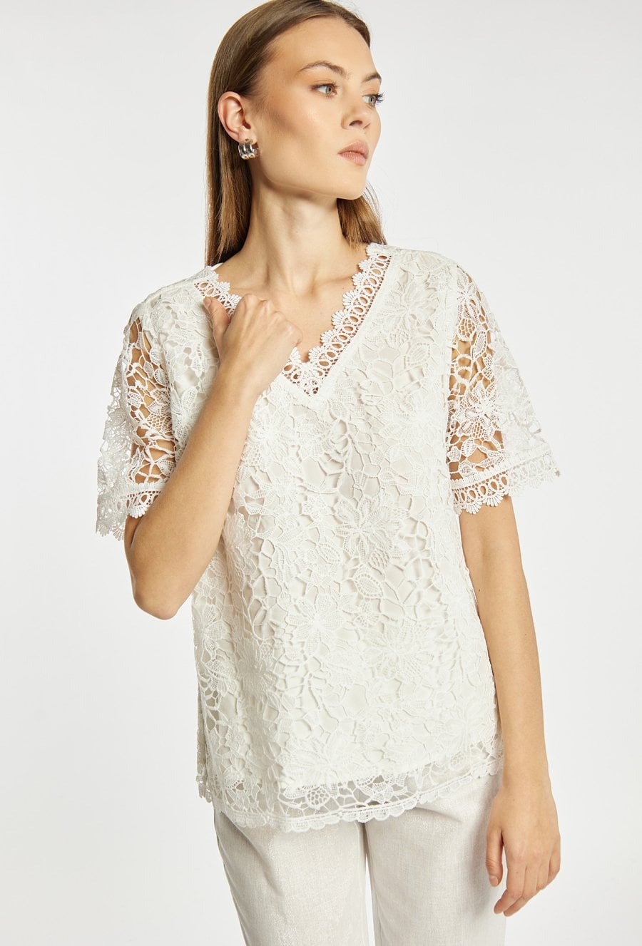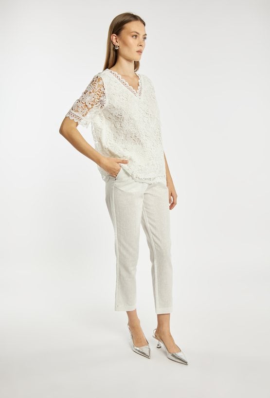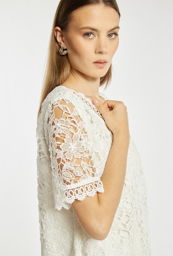Bluzka damska o luźnym, eleganckim kroju z krótkim rękawem. Model z dekoltem w kształcie litery V, wykończonym dekoracyjną koronką, która podkreśla kobiecy charakter. Idealna zarówno do eleganckich, jak i codziennych stylizacji. Modelka na zdjęciu ma 177 cm wzrostu i prezentuje rozmiar 36.