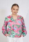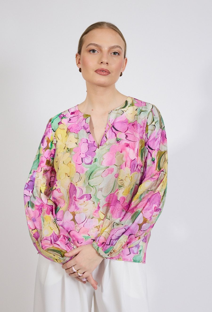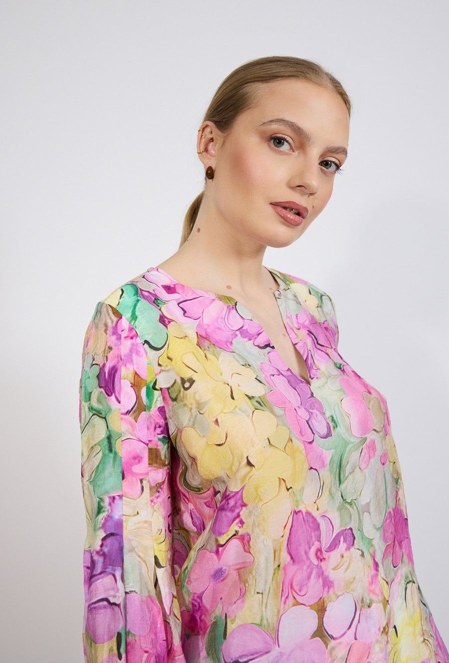 Bluzka damska o lekkim, swobodnym kroju. Model z długim rękawem zakończonym elastycznym mankietem oraz dekoltem w kształcie litery V z subtelnym rozcięciem. Całość zdobi efektowny, kolorowy wzór kwiatowy, który nadaje stylizacji świeżości i kobiecego charakteru. Modelka na zdjęciu ma 177 cm wzrostu i prezentuje rozmiar 36.