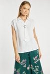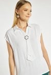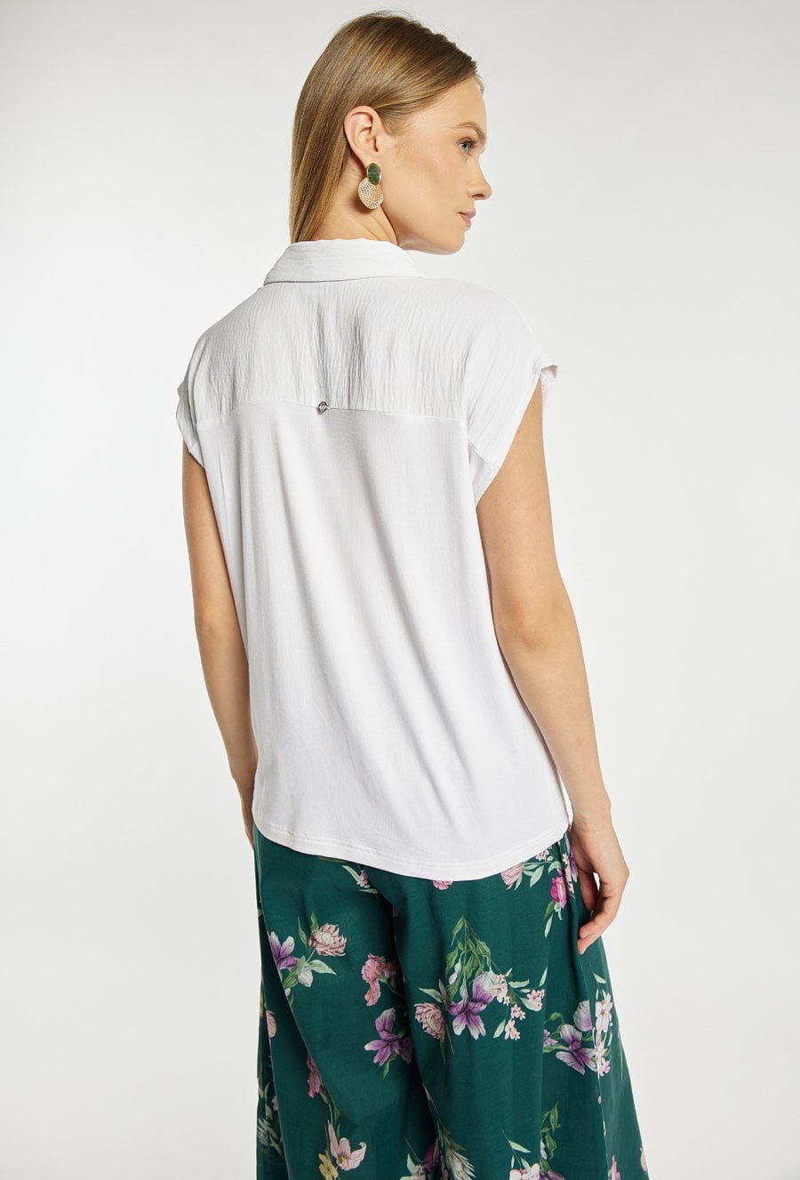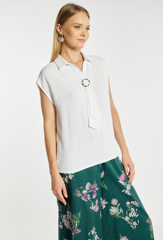Bluzka damska o luźnym, komfortowym kroju bez rękawów. Model z kołnierzykiem oraz dekoltem w kształcie litery V, ozdobiony efektownym detalem z wiązaniem, który nadaje całości nowoczesnego charakteru. Modelka na zdjęciu ma 177 cm wzrostu i prezentuje rozmiar S.